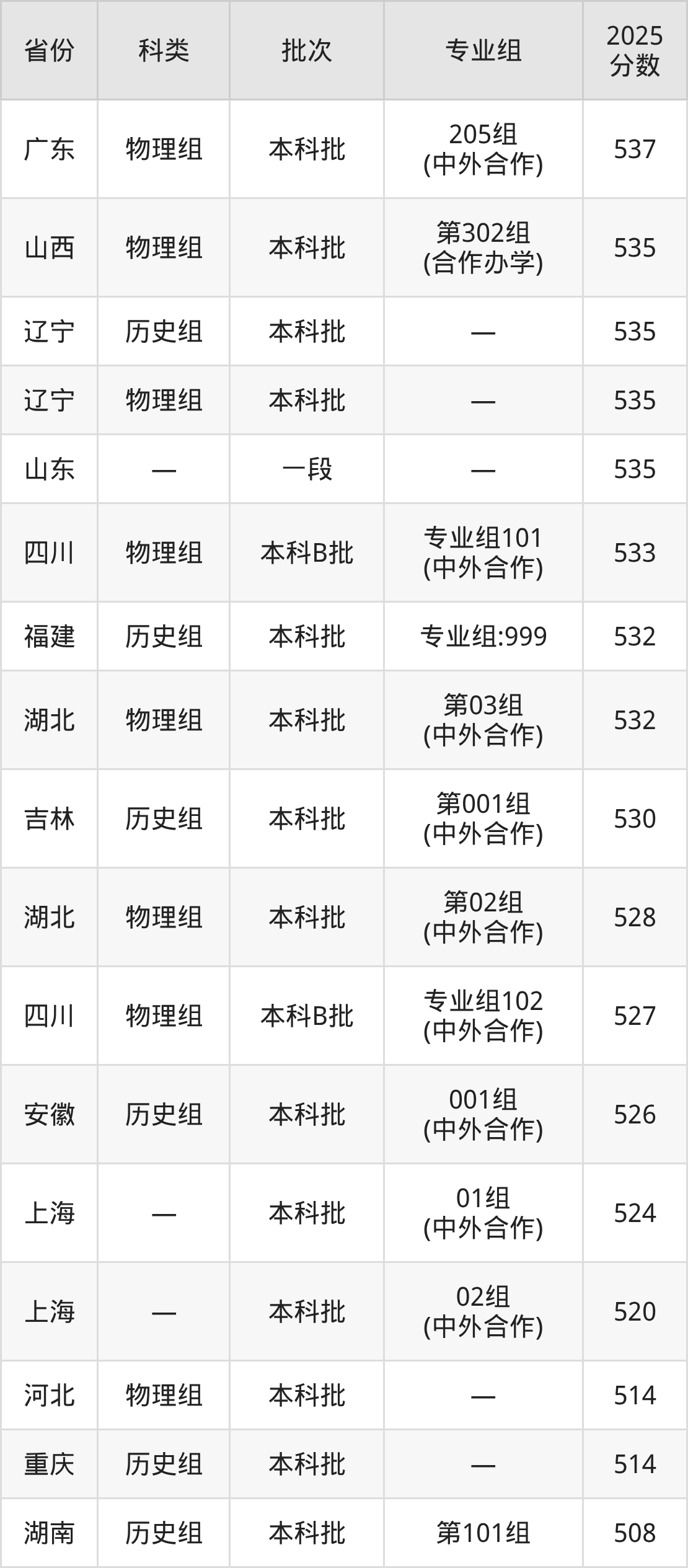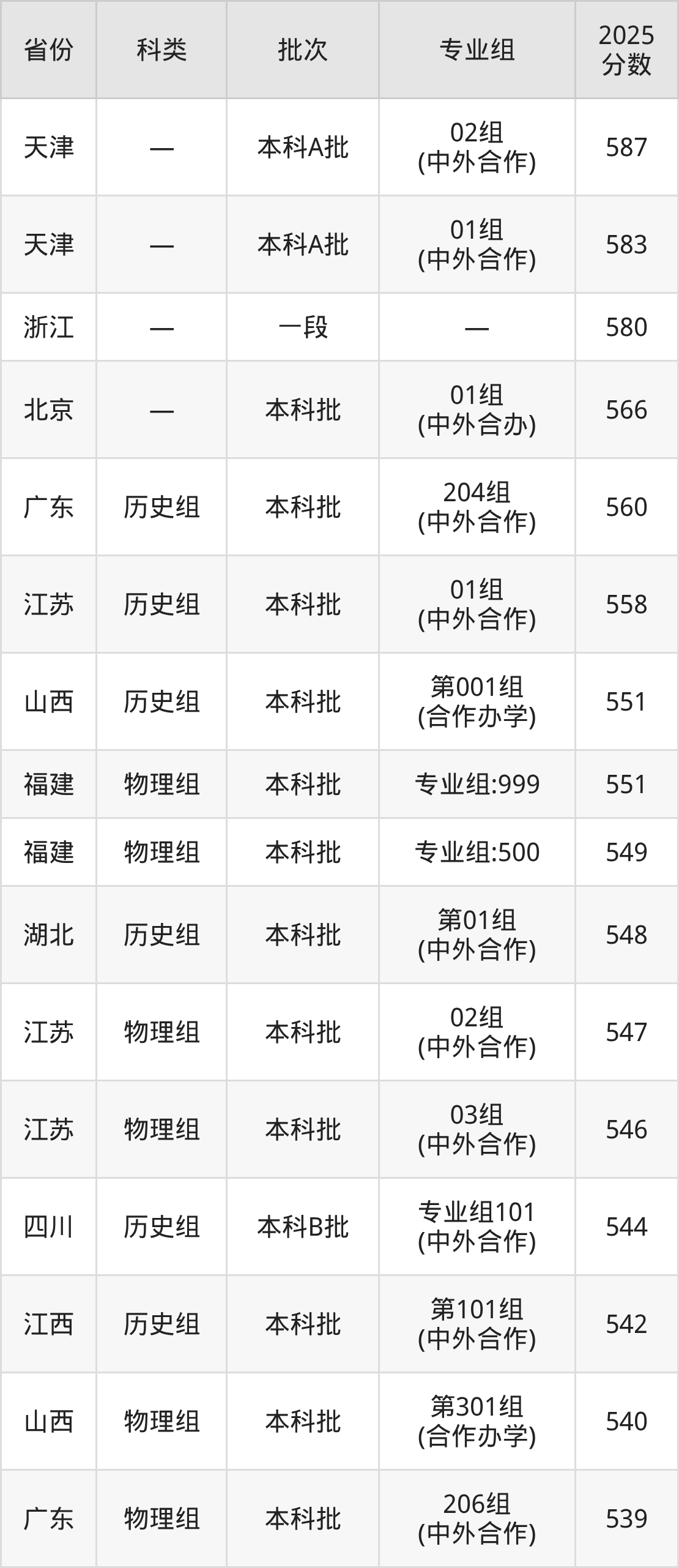 目前能查询到的最新分数为2025年招录数据,2026年温州肯恩大学录取分数线会在高考招录结束后公布,本届考生可以利用往年分数预估录取概率。