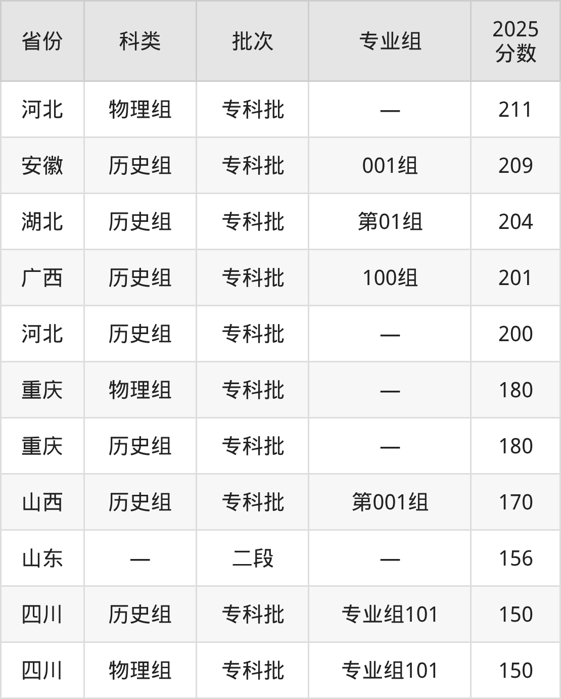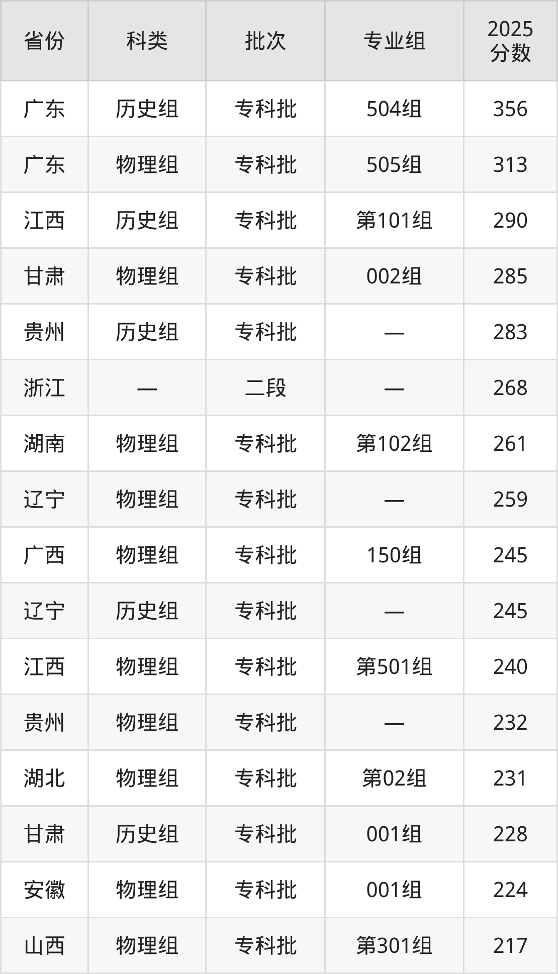 2025年四川长江职业学院在全国普通批次招生的录取分数范围位于150~356分之间,其中省内分数在150分,历史组最低分专业组为“专业组101”,考生150分即可报考,物理组最低分专业组为“专业组101”,考生150分即可报考。