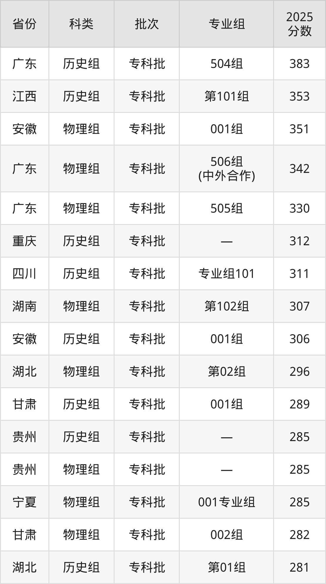 而广东地区历史组考生的分数门槛最高,2025年重庆建筑科技职业学院504组在广东招生最低分为383分,考生至少要超专科线168分才有可能被录取。