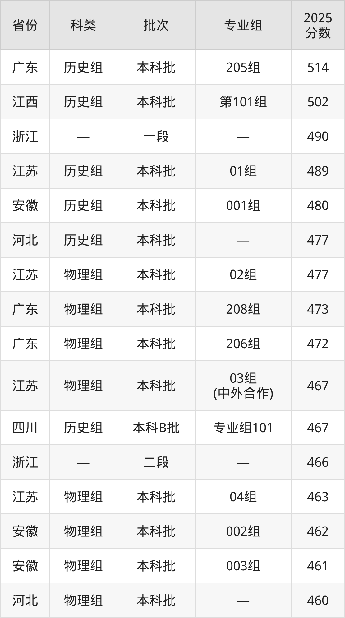 而广东地区历史组考生的分数门槛最高,2025年阳光学院205组在广东招生最低分为514分,考生至少要超本科线50分才有可能被录取。