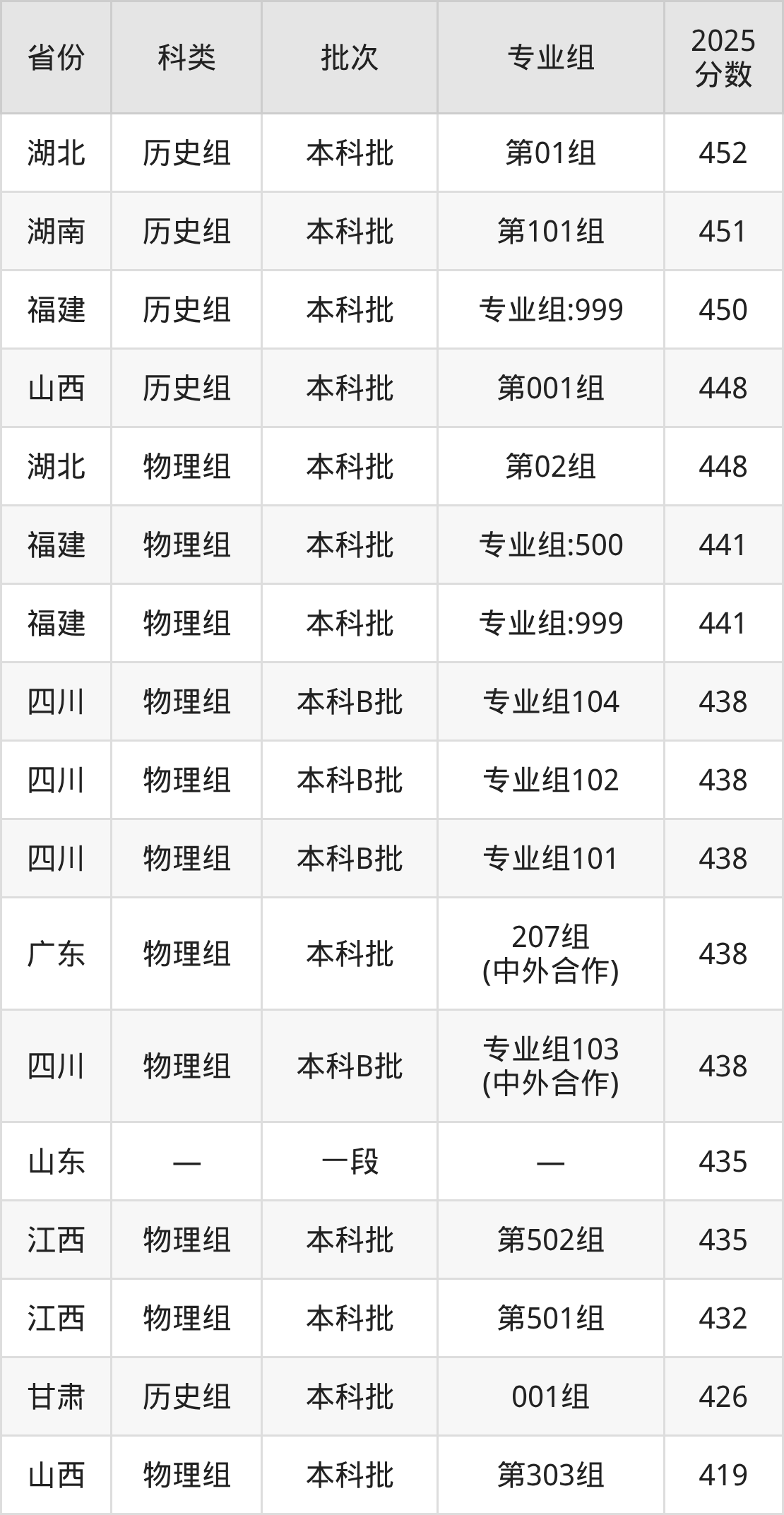 2025年阳光学院在全国普通批次招生的录取分数范围位于372~514分之间,其中省内分数范围为441分~450分,历史组最低分专业组为“专业组:999”,考生450分即可报考,物理组最低分专业组为“专业组:500”,考生441分即可报考。