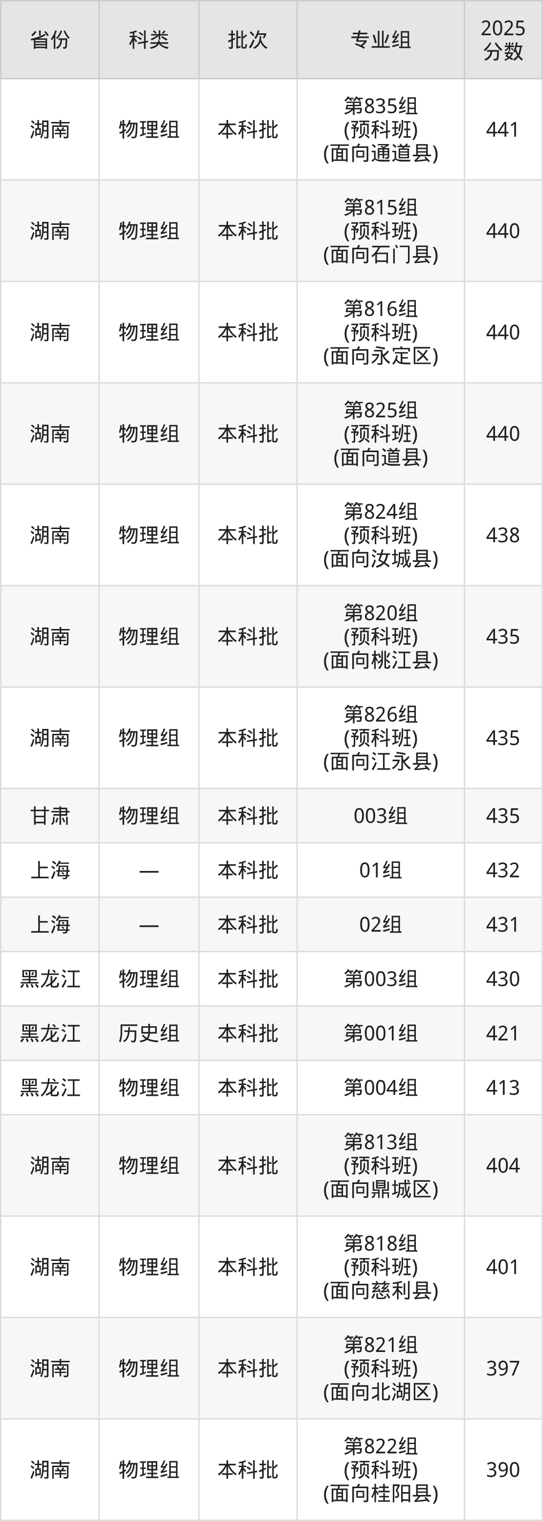 2025年湘南学院在全国普通批次招生的录取分数范围位于378~572分之间,其中省内分数范围为390分~521分,历史组最低分专业组为“第805组(预科班)(面向慈利县)”,考生461分即可报考,物理组最低分专业组为“第822组(预科班)(面向桂阳县)”,考生390分即可报考。