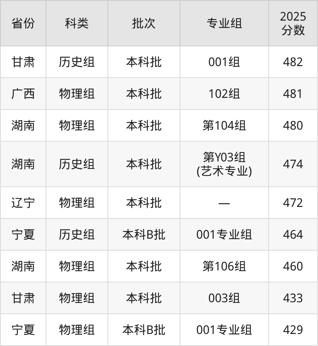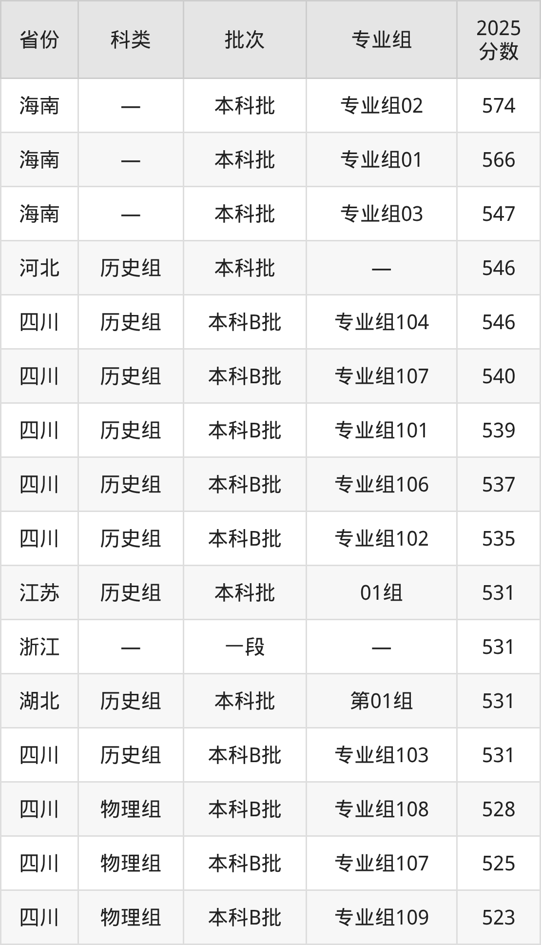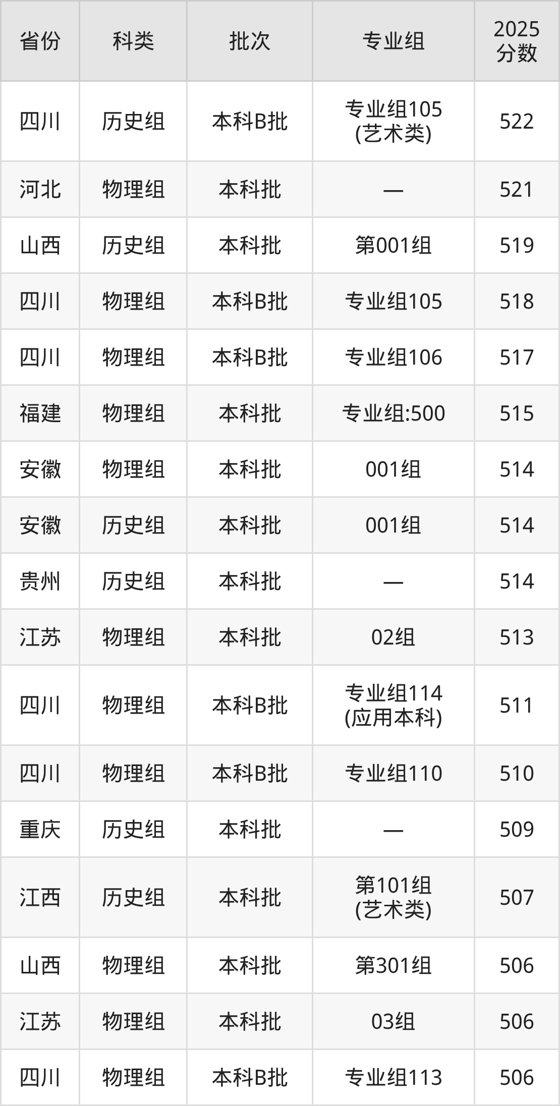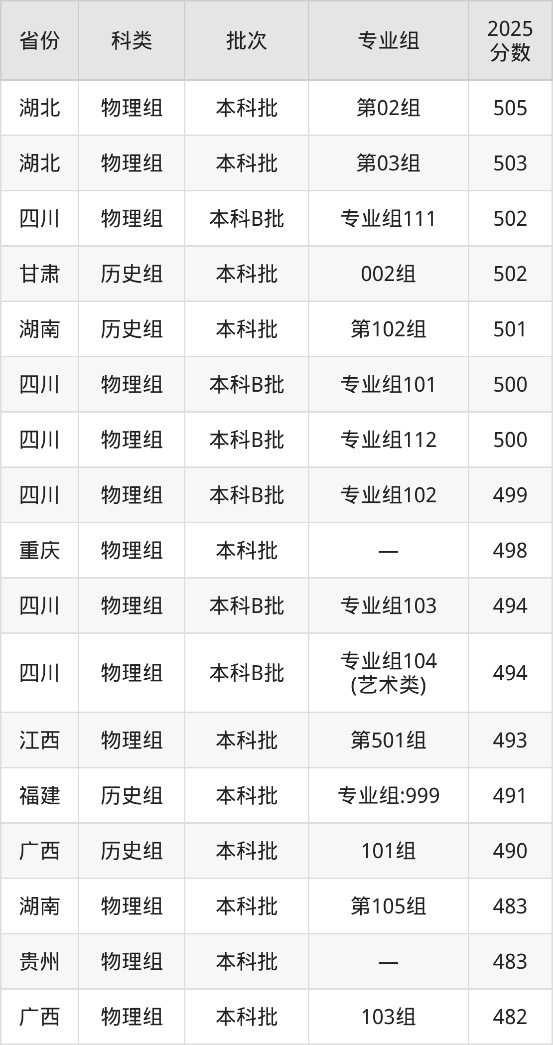 2025年宜宾学院在全国普通批次招生的录取分数范围位于429~574分之间,其中省内分数范围为494分~546分,历史组最低分专业组为“专业组105(艺术类)”,考生522分即可报考,物理组最低分专业组为“专业组103”,考生494分即可报考。