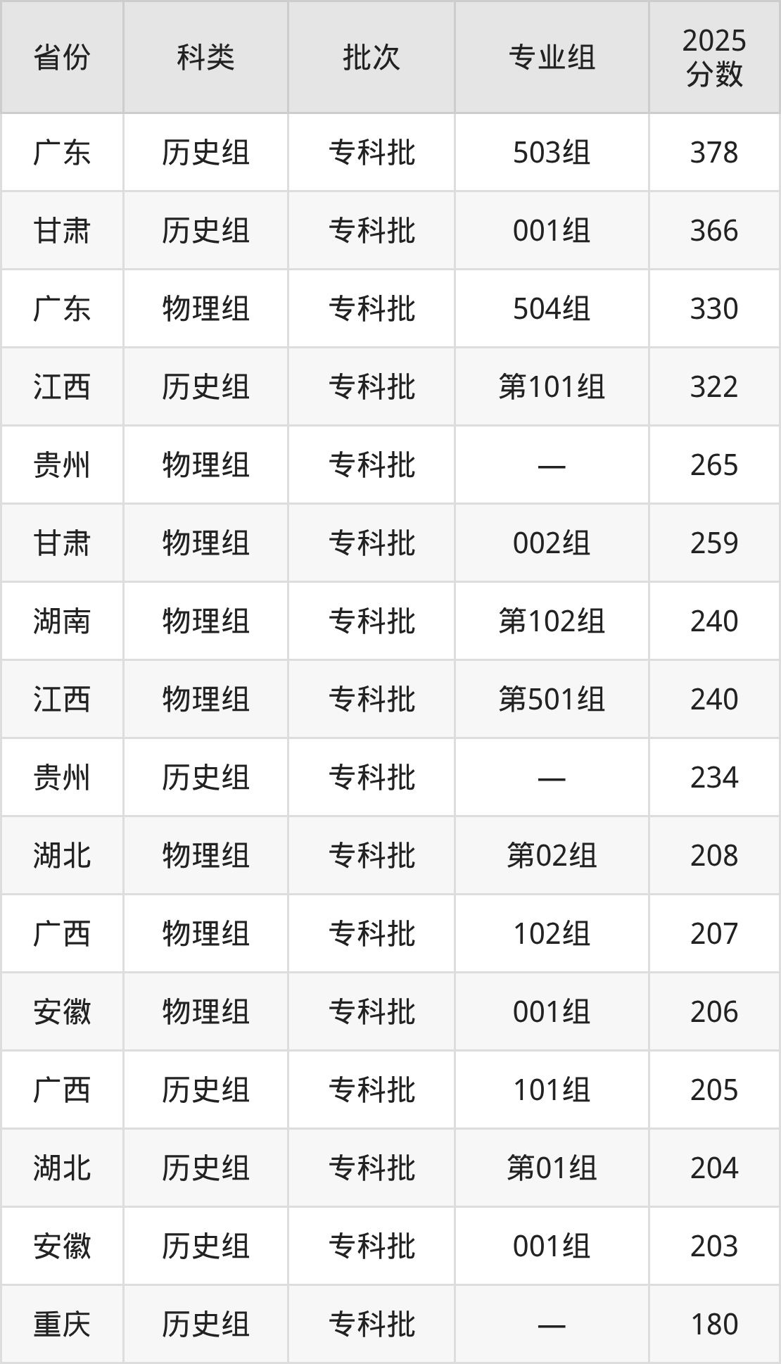 而广东地区历史组考生的分数门槛最高,2025年福州软件职业技术学院503组在广东招生最低分为378分,考生至少要超专科线163分才有可能被录取。