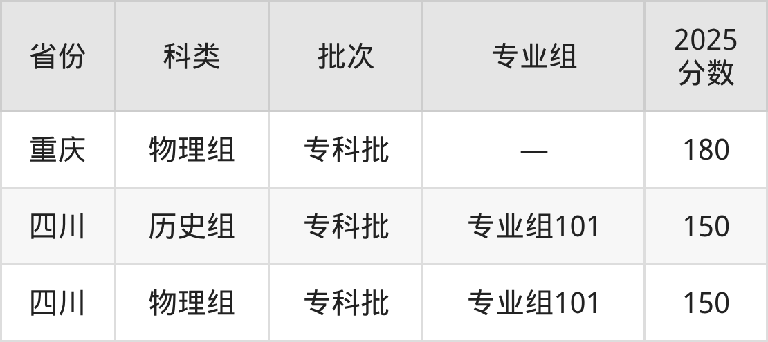 福州软件职业技术学院在省外招生的最低分为150分,其中四川地区历史组考生上福州软件职业技术学院的分数门槛最低,考生成绩达专科线即可报考。其次是重庆历史组考生,上福州软件职业技术学院至少要超专科线0分(180分)。