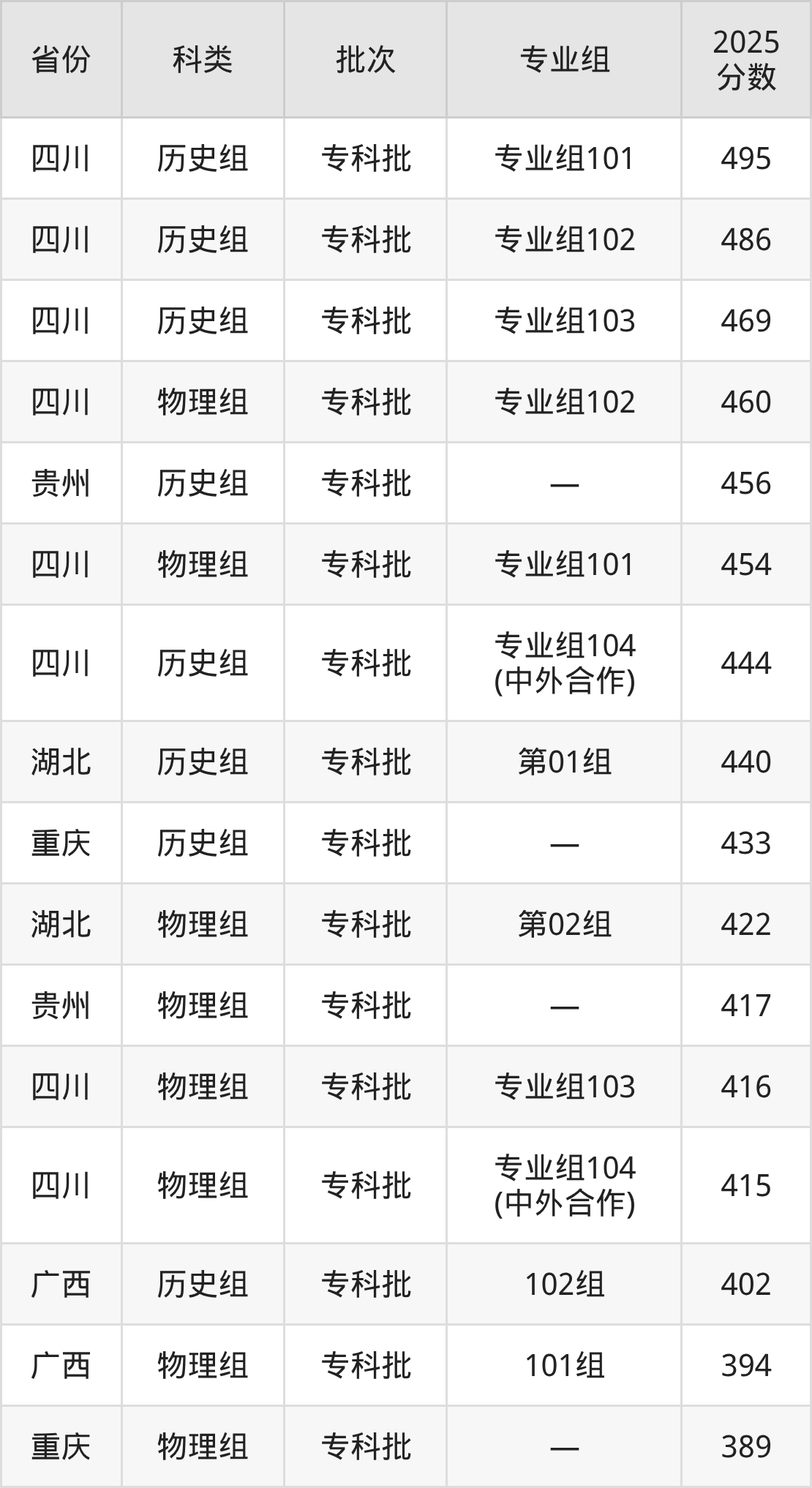 下面是成都职业技术学院2025年在全国各省的录取分数线一览表,供参考: