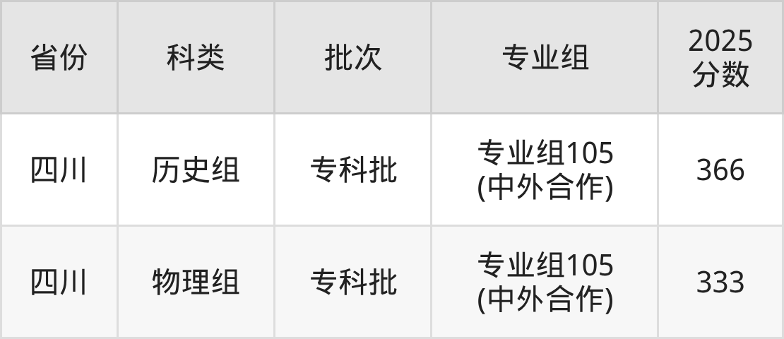 2025年成都职业技术学院在全国普通批次招生的录取分数范围位于333~495分之间,其中省内分数范围为333分~495分,历史组最低分专业组为“专业组105(中外合作)”,考生366分即可报考,物理组最低分专业组为“专业组105(中外合作)”,考生333分即可报考。