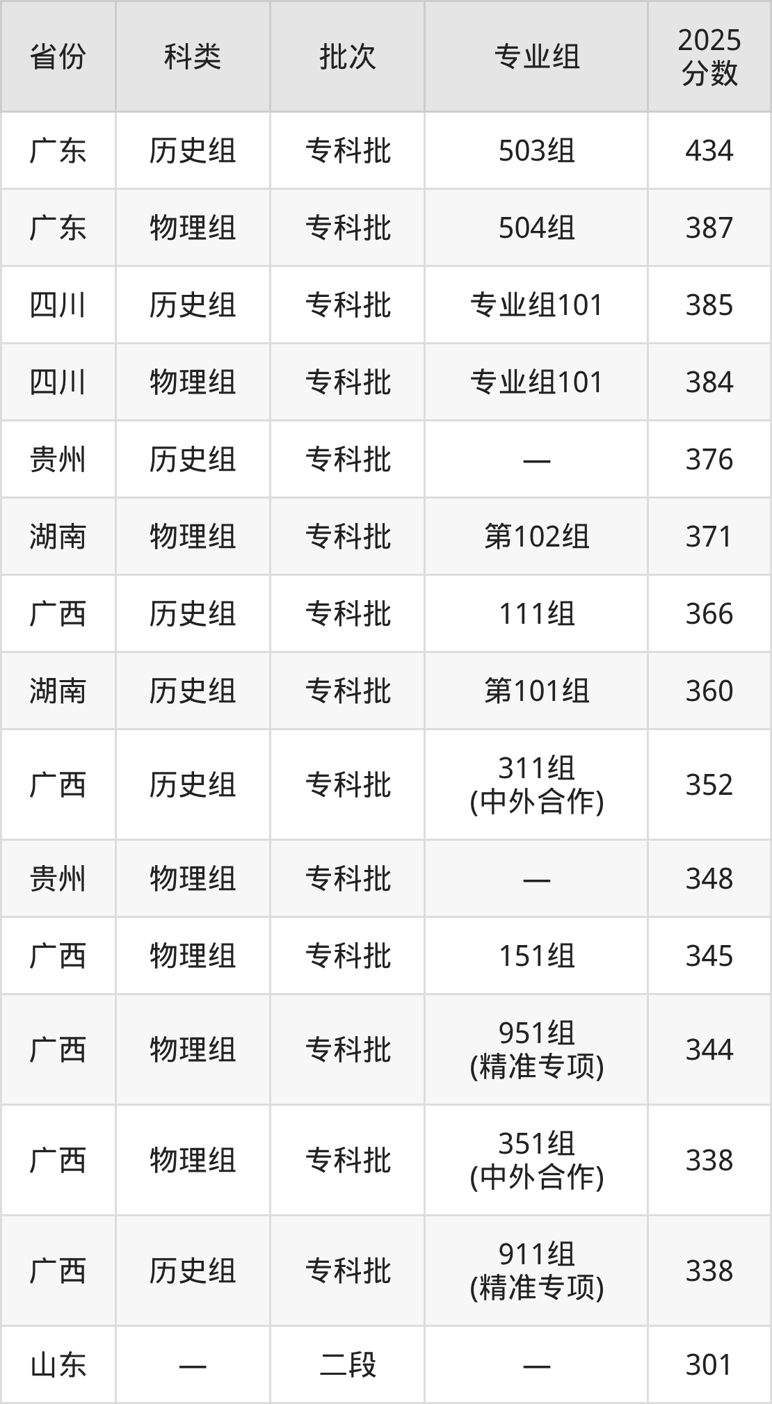 而广东地区历史组考生的分数门槛最高,2025年广西交通职业技术学院503组在广东招生最低分为434分,考生至少要超专科线219分才有可能被录取。