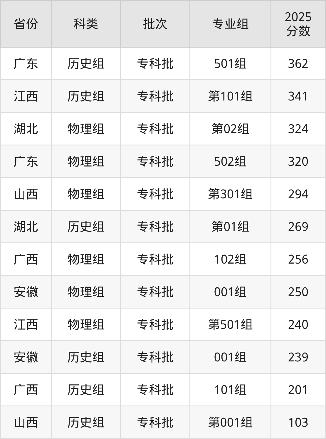 而江西地区历史组考生的分数门槛最高,2025年惠州经济职业技术学院第101组在江西招生最低分为341分,考生至少要超专科线51分才有可能被录取。