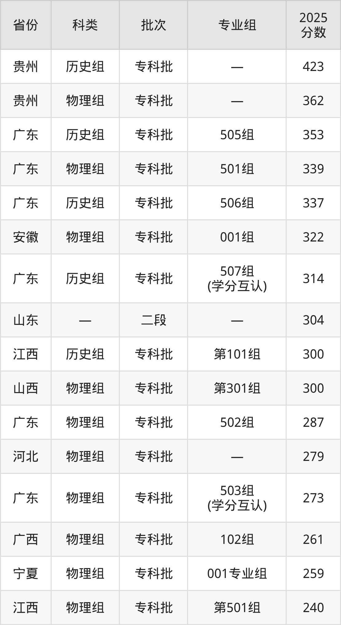 而贵州地区历史组考生的分数门槛最高,2025年广州珠江职业技术学院在贵州招生最低分为423分,考生至少要超专科线243分才有可能被录取。
