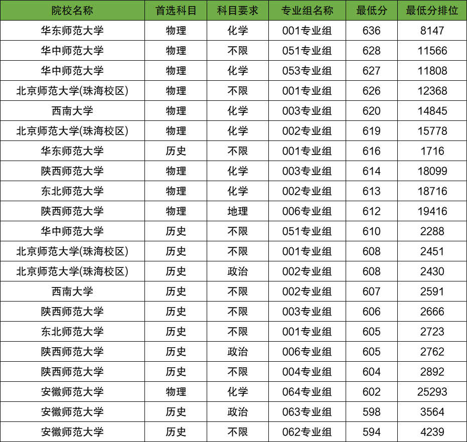 安徽优师专项院校中历史类录取分数线最高的是华东师范大学001专业组,最低分数线为616分,最低位次1716位;录取分数线最低的是安徽师范大学062专业组,最低分数线为594分,最低位次4239位。