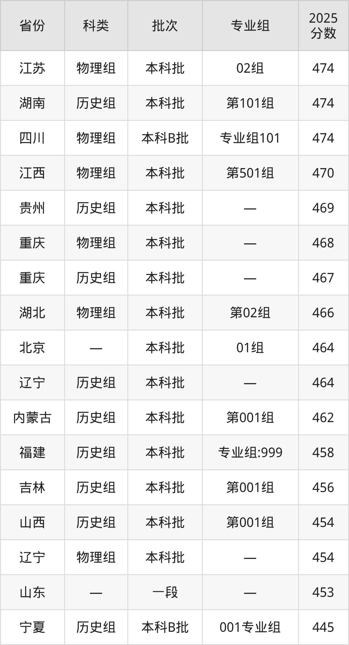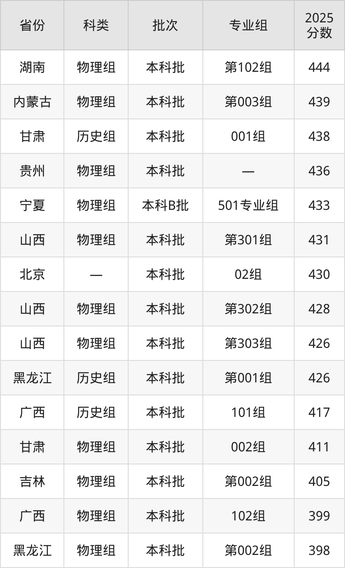2025年山西晋中理工学院在全国普通批次招生的录取分数范围位于398~548分之间,其中省内分数范围为426分~454分,历史组最低分专业组为“第001组”,考生454分即可报考,物理组最低分专业组为“第303组”,考生426分即可报考。