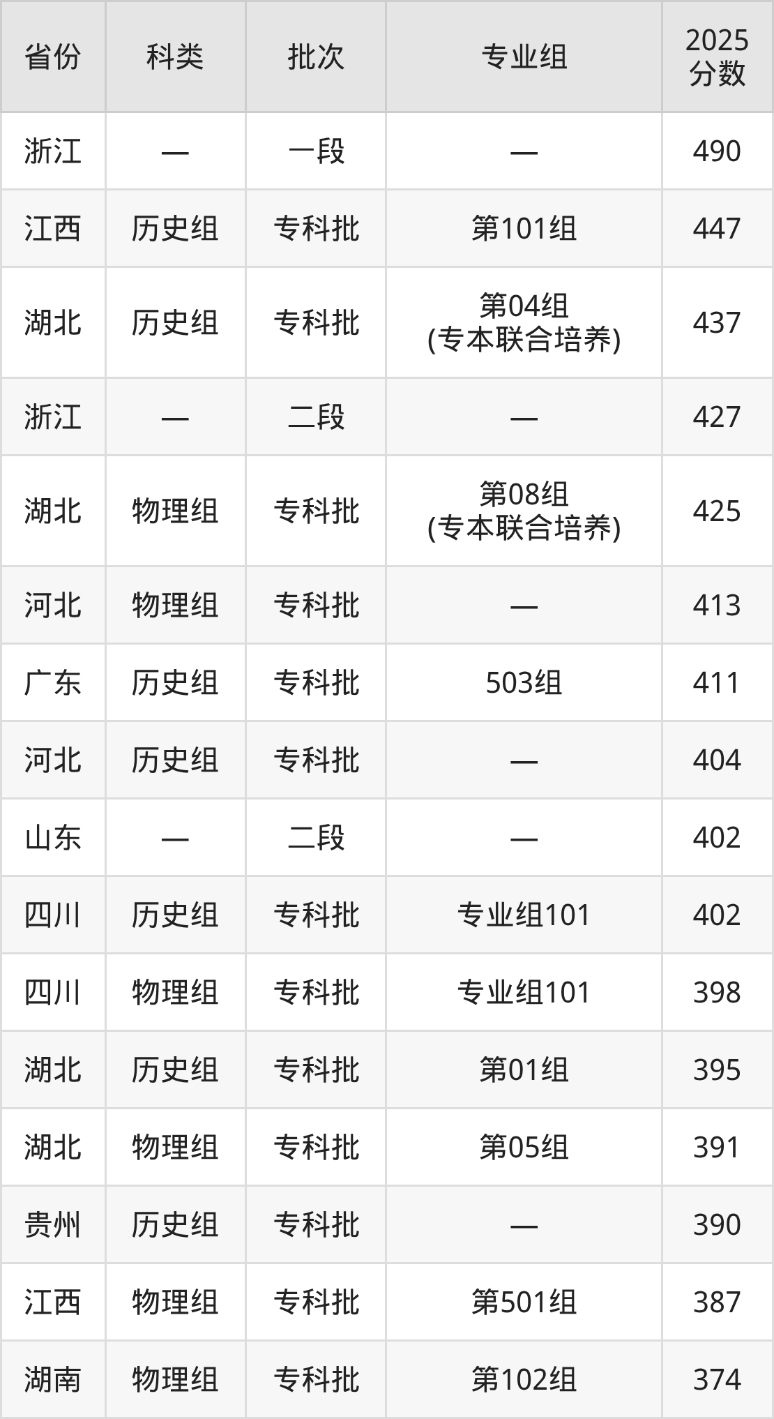 而浙江地区考生的分数门槛最高,2025年湖北轻工职业技术学院在浙江招生最低分为490分,考生至少要超一段线0分才有可能被录取。