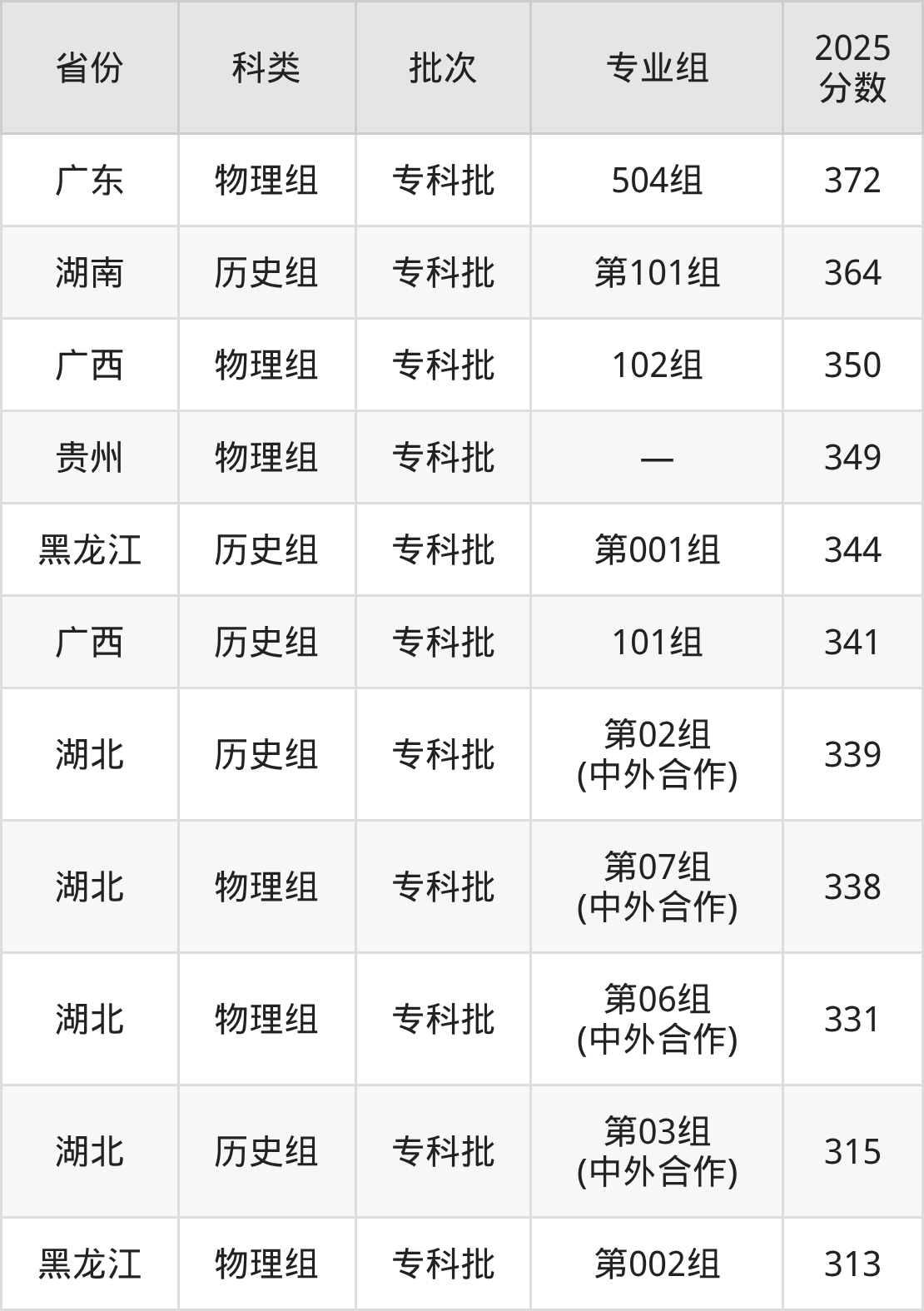 2025年湖北轻工职业技术学院在全国普通批次招生的录取分数范围位于313~490分之间,其中省内分数范围为315分~437分,历史组最低分专业组为“第03组(中外合作)”,考生315分即可报考,物理组最低分专业组为“第06组(中外合作)”,考生331分即可报考。