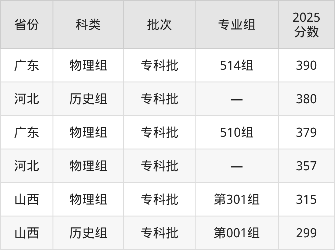 惠州工程职业学院在省内招生最低录取分数线为379分,在省外招生最低录取分数线为299分,不同地区、不同科类的考生最低分有差异。