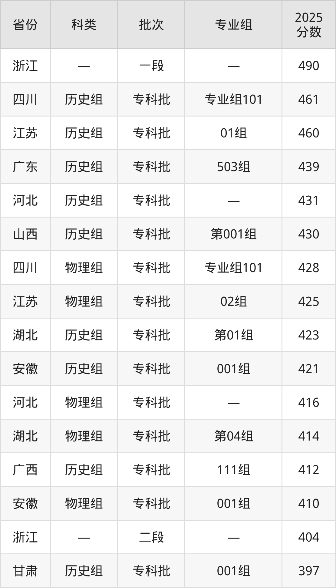 而浙江地区考生的分数门槛最高,2025年武汉民政职业学院在浙江招生最低分为490分,考生至少要超一段线0分才有可能被录取。
