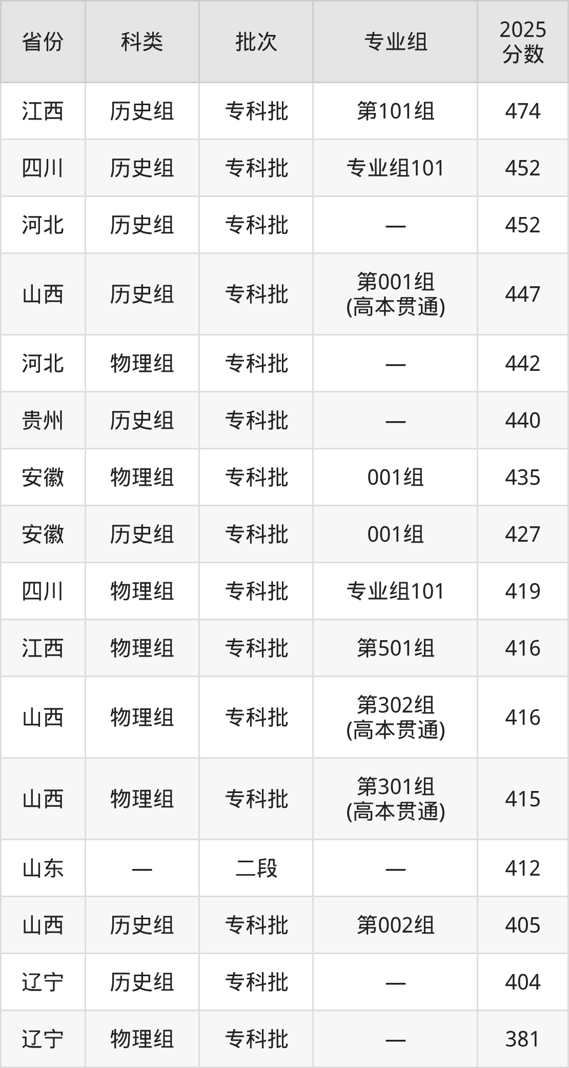 而江西地区历史组考生的分数门槛最高,2025年山西铁道职业技术学院第101组在江西招生最低分为474分,考生至少要超专科线184分才有可能被录取。