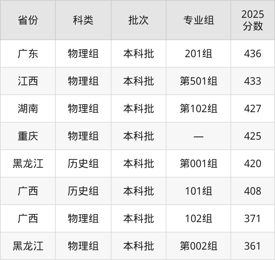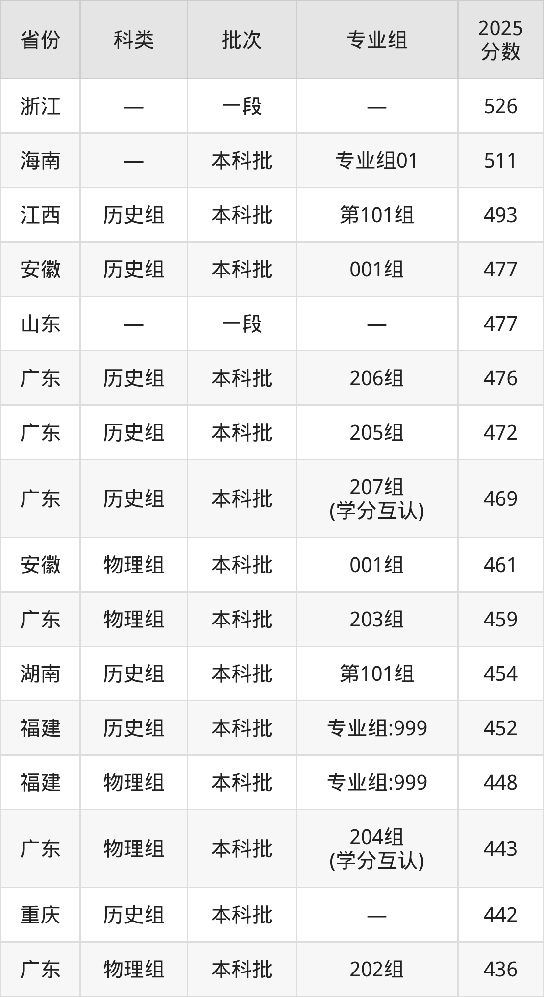 2025年广东培正学院在全国普通批次招生的录取分数范围位于361~526分之间,其中省内分数范围为436分~476分,历史组最低分专业组为“207组(学分互认)”,考生469分即可报考,物理组最低分专业组为“202组”,考生436分即可报考。