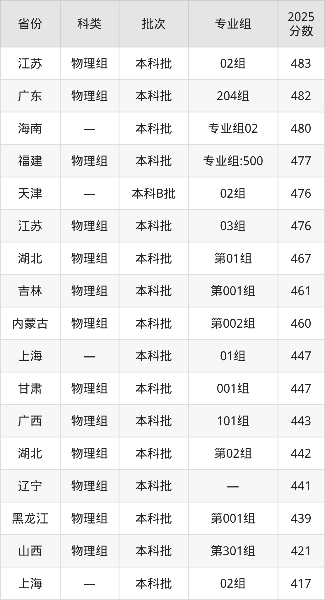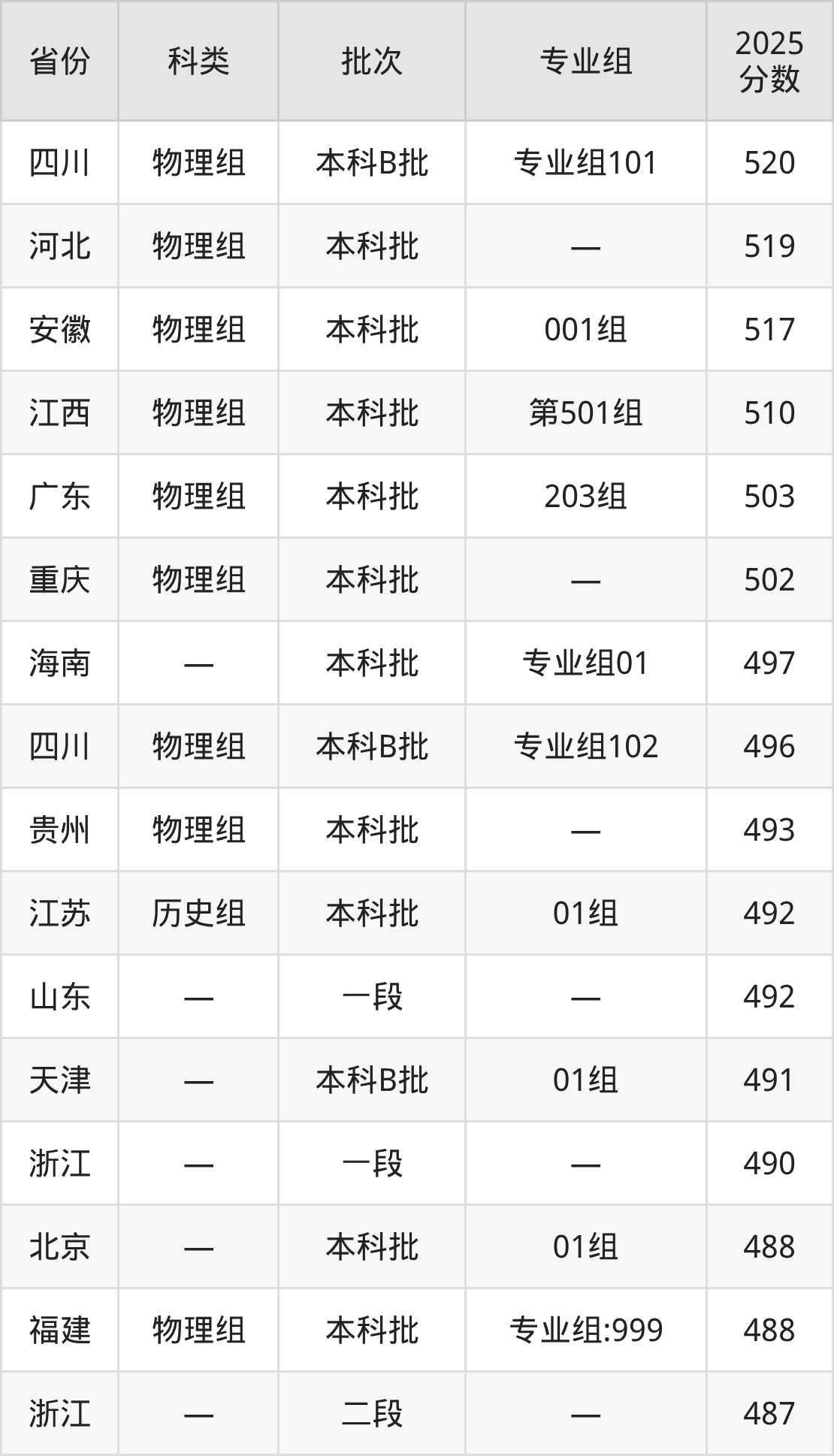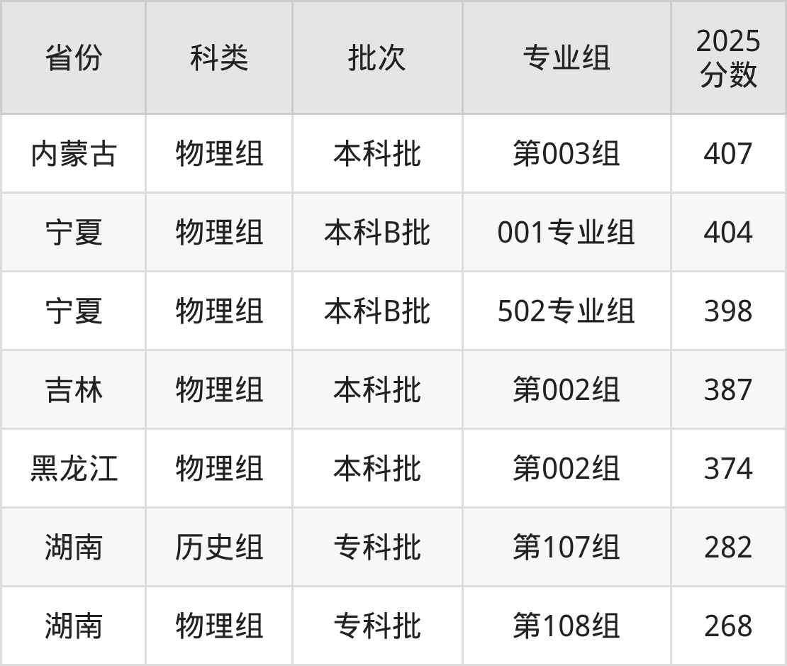 2025年长沙医学院在全国普通批次招生的录取分数范围位于268~520分之间,其中省内分数范围为268分~282分,物理组最低分专业组为“第108组”,考生268分即可报考,历史组最低分专业组为“第107组”,考生282分即可报考。