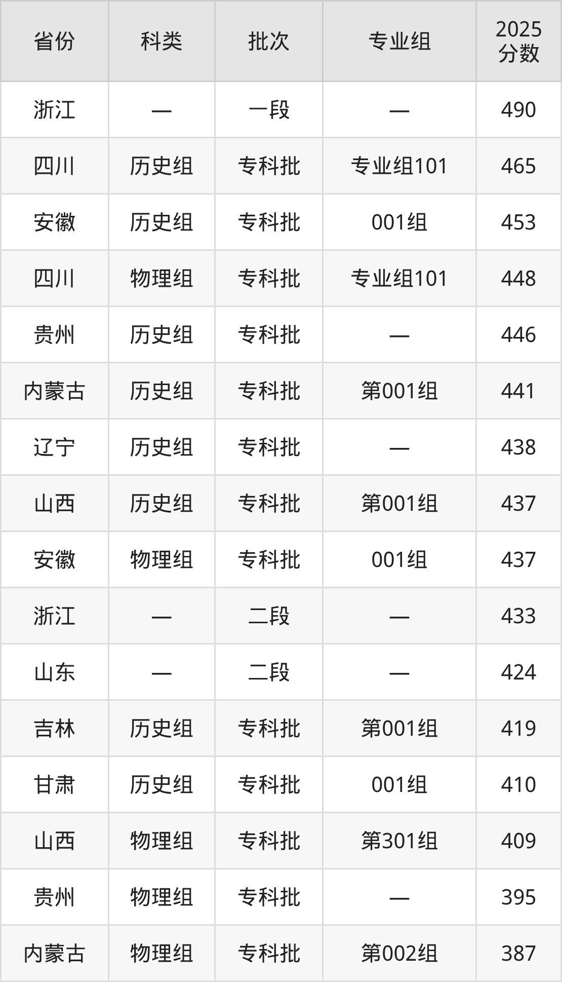 而浙江地区考生的分数门槛最高,2025年山东中医药高等专科学校在浙江招生最低分为490分,考生至少要超一段线0分才有可能被录取。