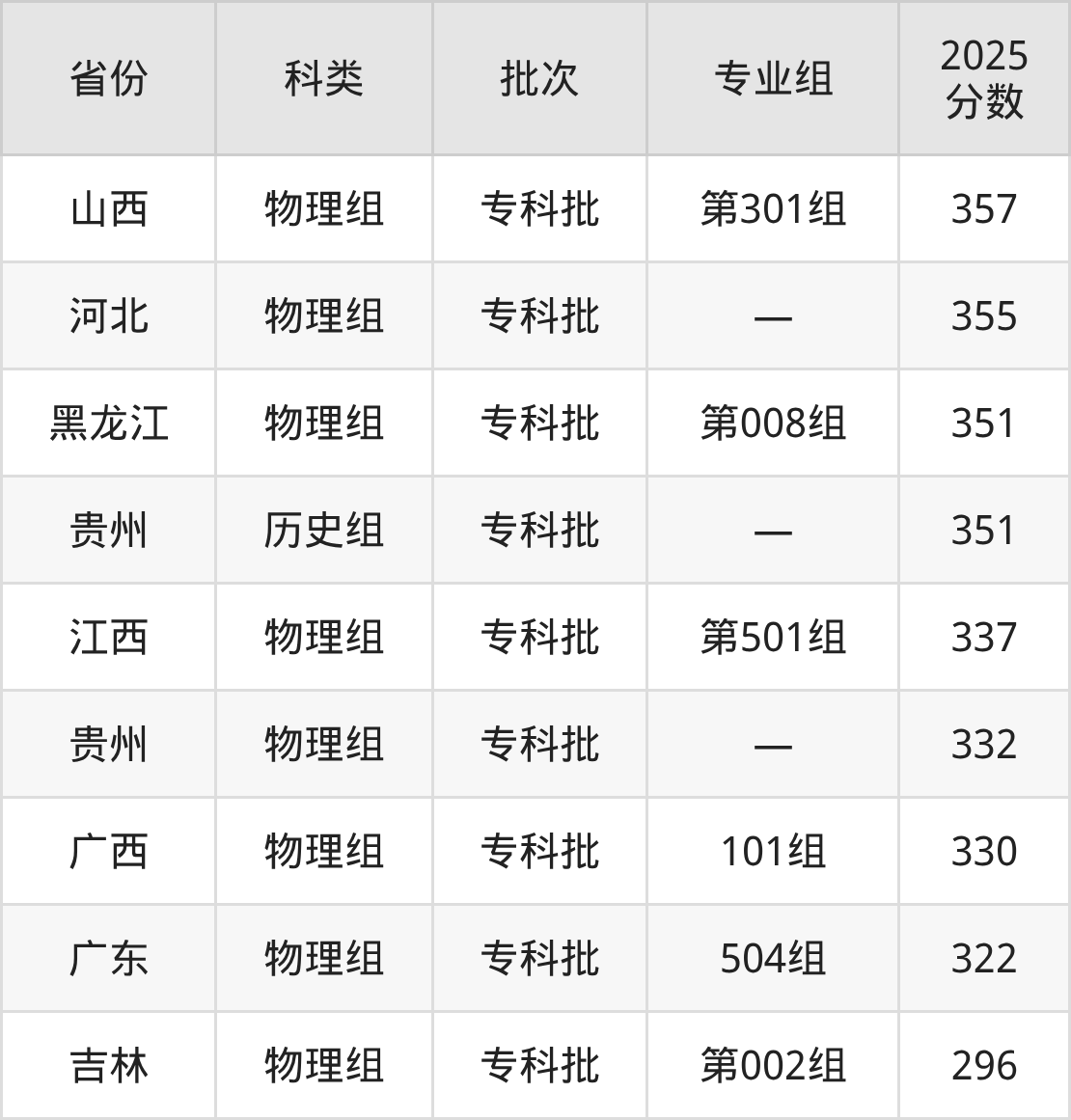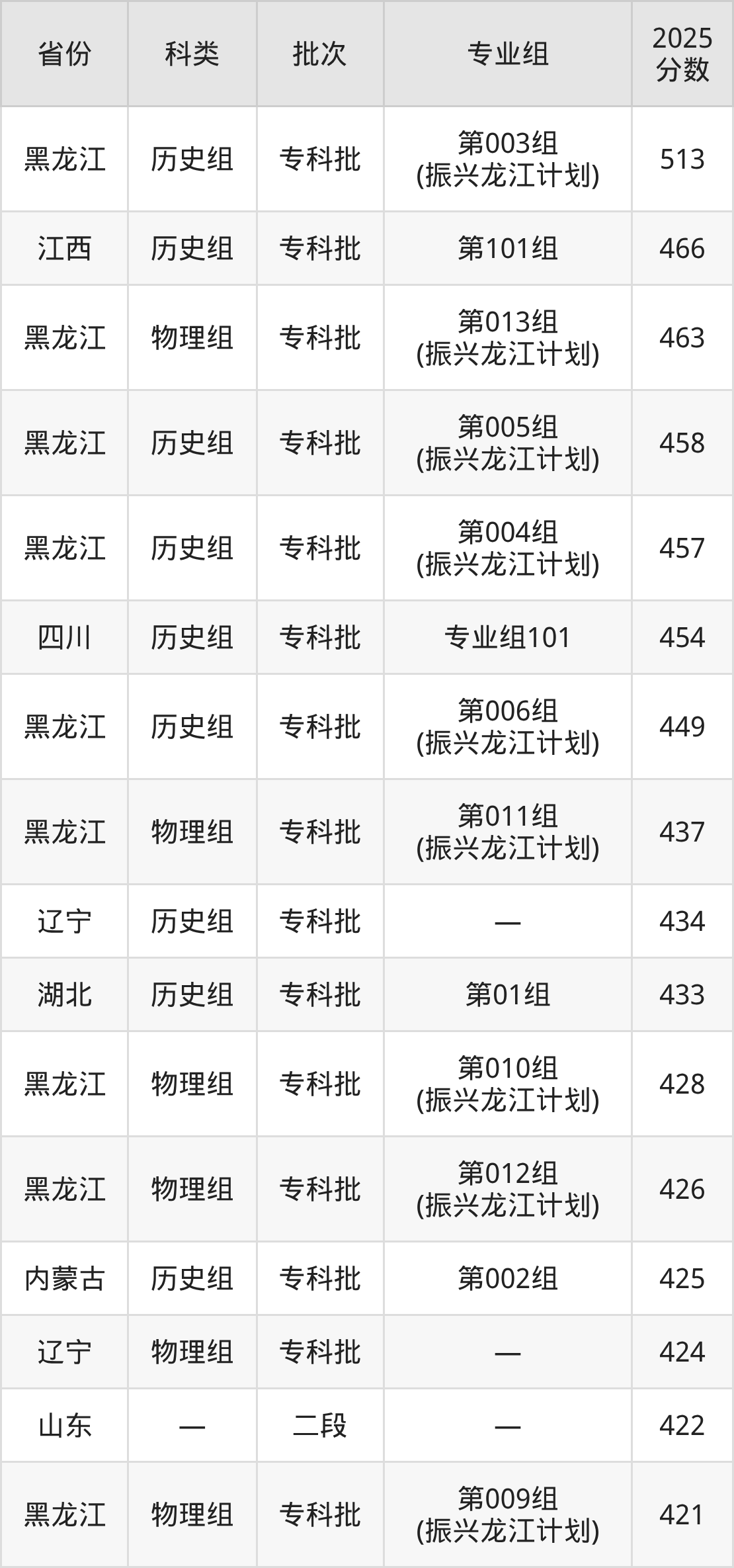 而江西地区历史组考生的分数门槛最高,2025年大庆医学高等专科学校第101组在江西招生最低分为466分,考生至少要超专科线176分才有可能被录取。