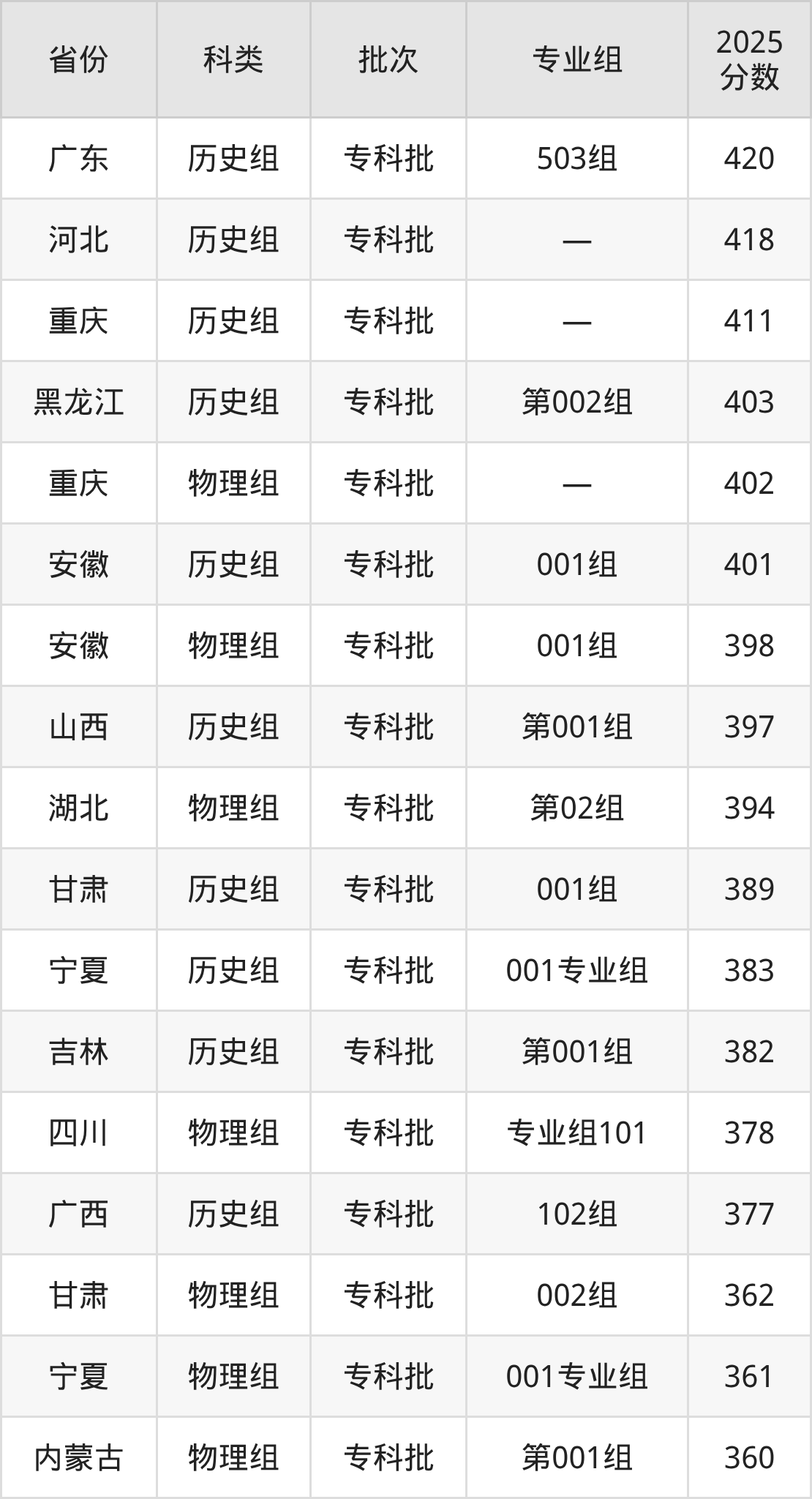 下面是大庆医学高等专科学校2025年在全国各省的录取分数线一览表,供参考: