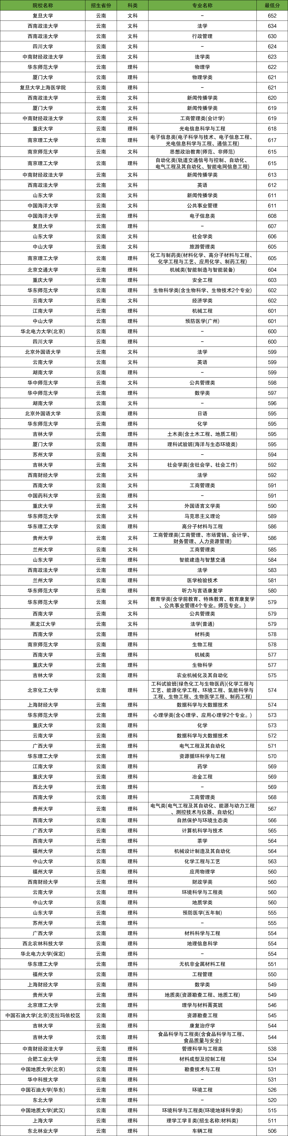 云南理科考生中比较容易考的有东北林业大学、上海大学、中国地质大学(武汉),对应最低分为506分、511分、515分。