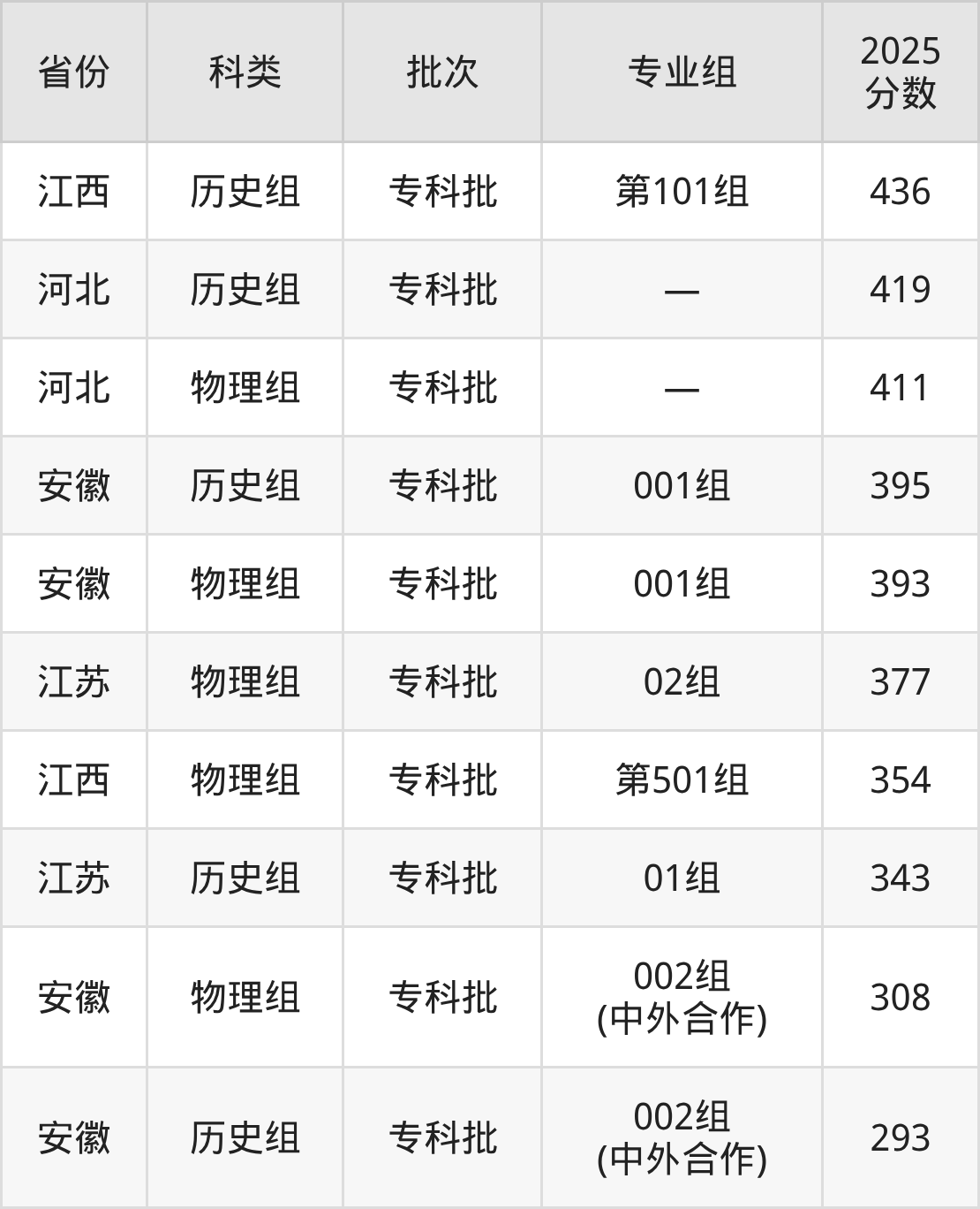 而江西地区历史组考生的分数门槛最高,2025年滁州城市职业学院第101组在江西招生最低分为436分,考生至少要超专科线146分才有可能被录取。