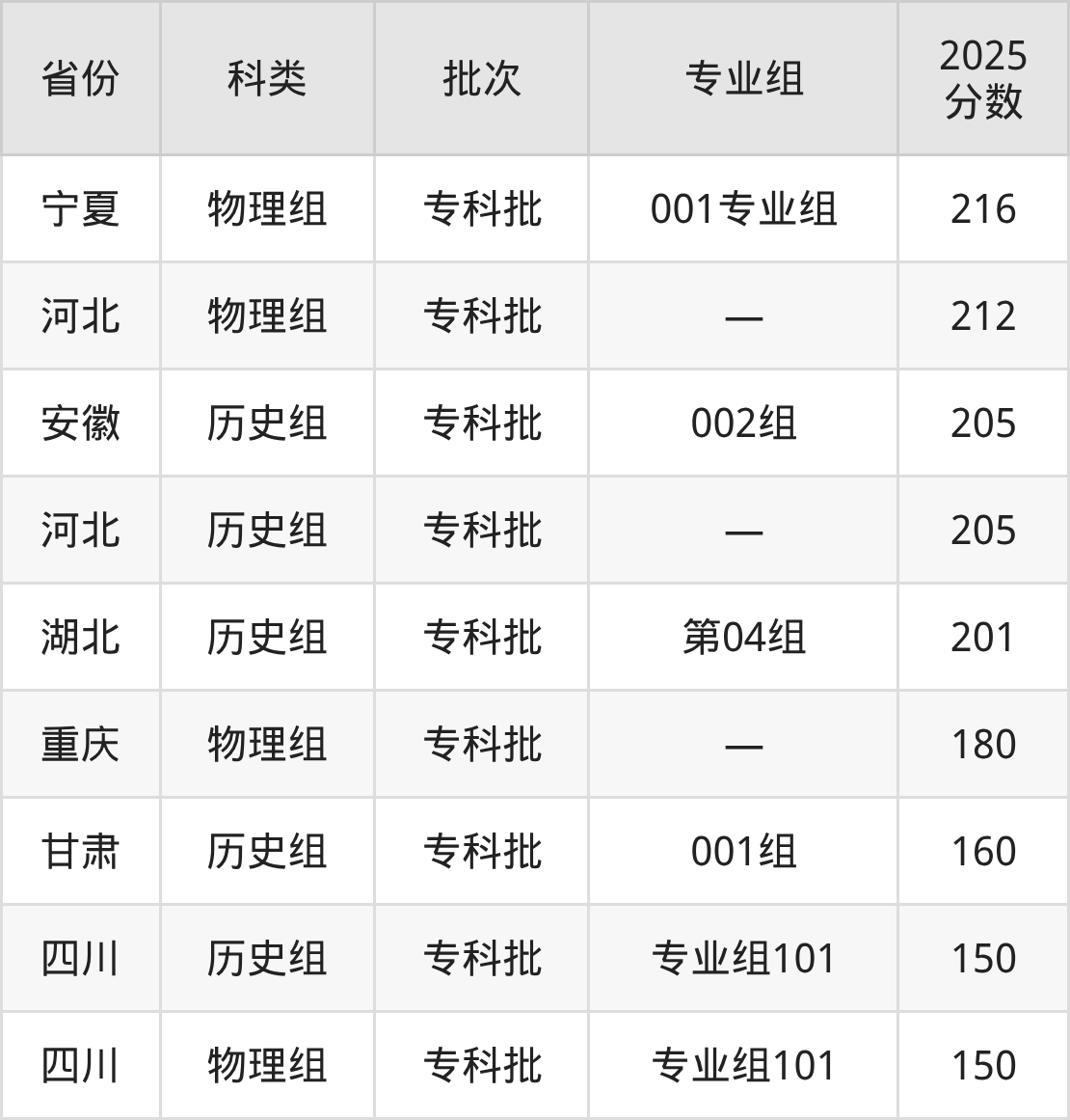江西软件职业技术大学在省外招生的最低分为150分,其中四川地区历史组考生上江西软件职业技术大学的分数门槛最低,考生成绩达专科线即可报考。其次是甘肃历史组考生,上江西软件职业技术大学至少要超专科线0分(160分)。