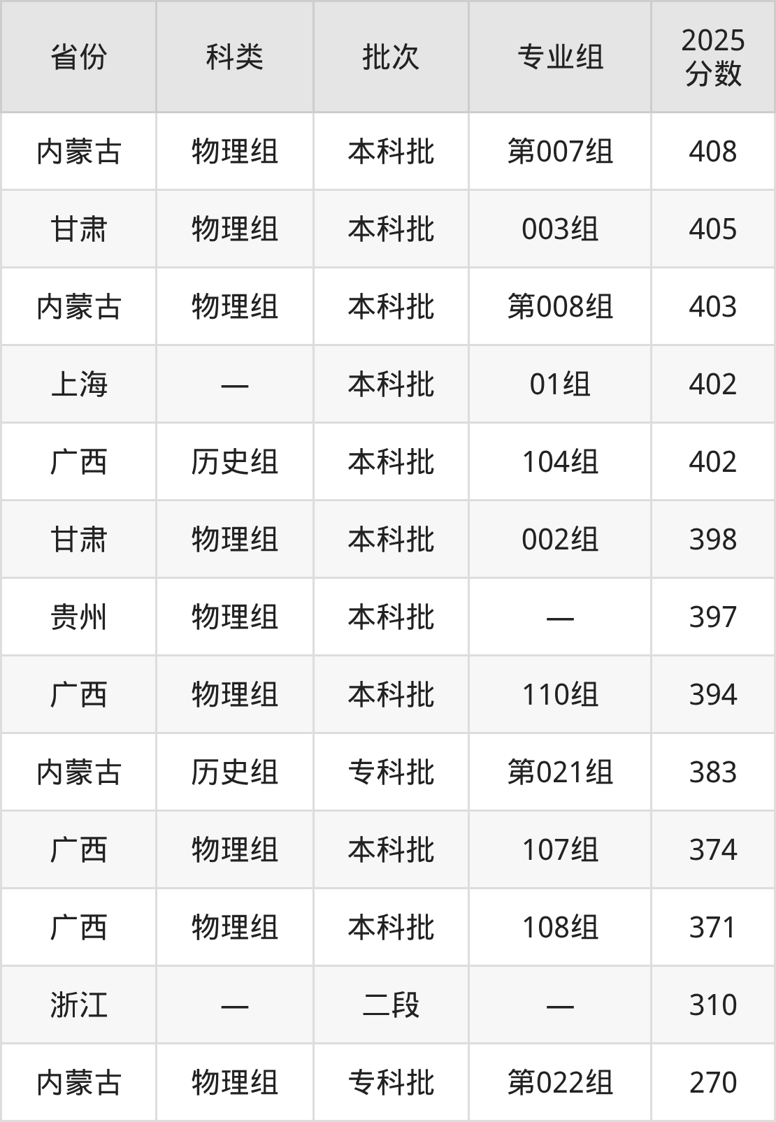 西安培华学院在省外招生的最低分为270分,其中内蒙古地区物理组考生上西安培华学院的分数门槛最低,考生成绩超专科线110分(270分)可上。其次是浙江考生,上西安培华学院至少要超二段线42分(310分)。