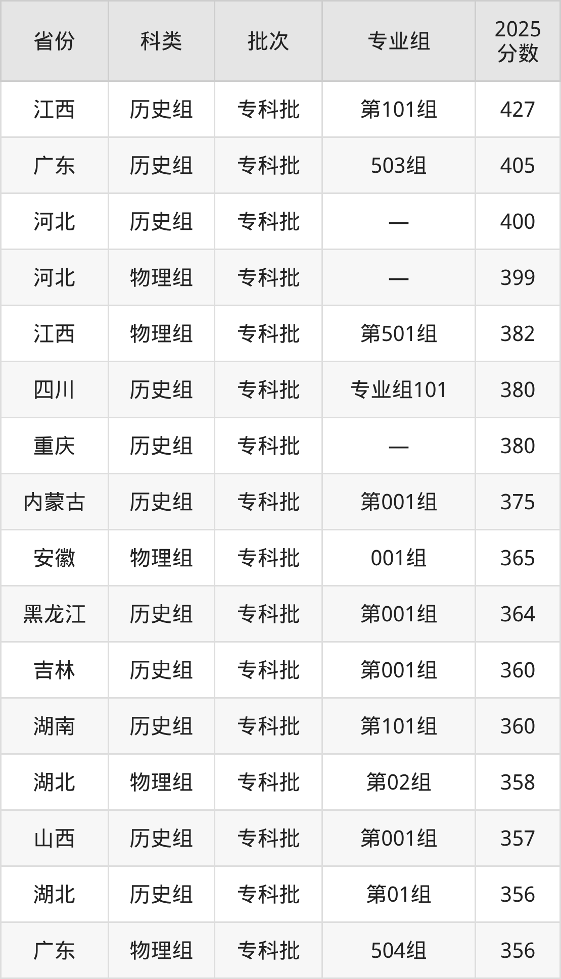 而江西地区历史组考生的分数门槛最高,2025年安阳职业技术学院第101组在江西招生最低分为427分,考生至少要超专科线137分才有可能被录取。