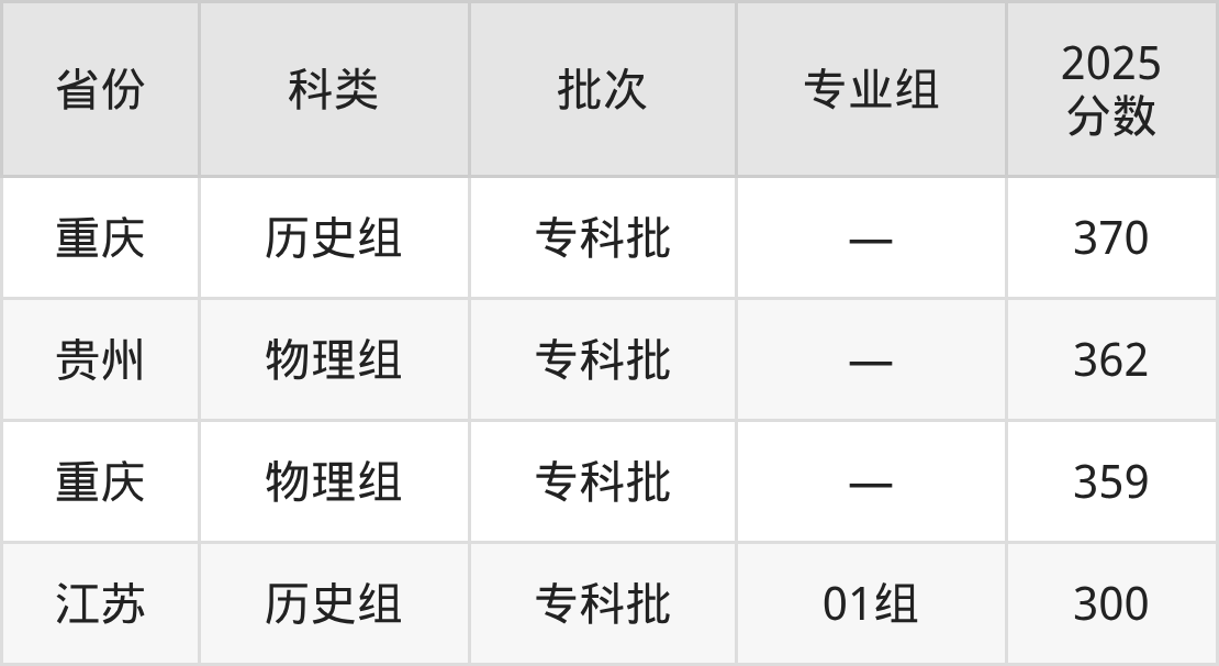 下面是重庆工信职业学院2025年在全国各省的录取分数线一览表,供参考: