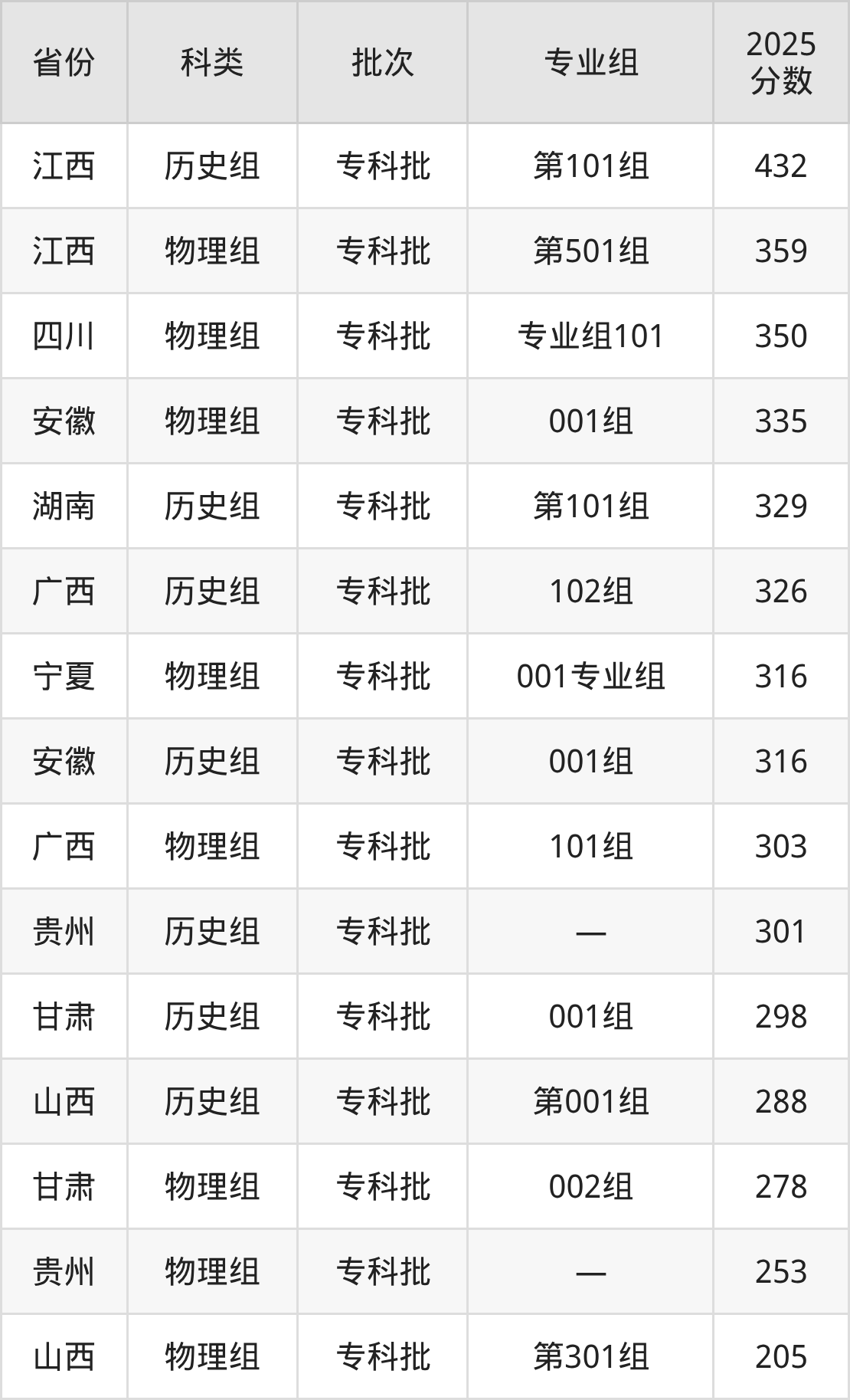 而江西地区历史组考生的分数门槛最高,2025年闽北职业技术学院第101组在江西招生最低分为432分,考生至少要超专科线142分才有可能被录取。