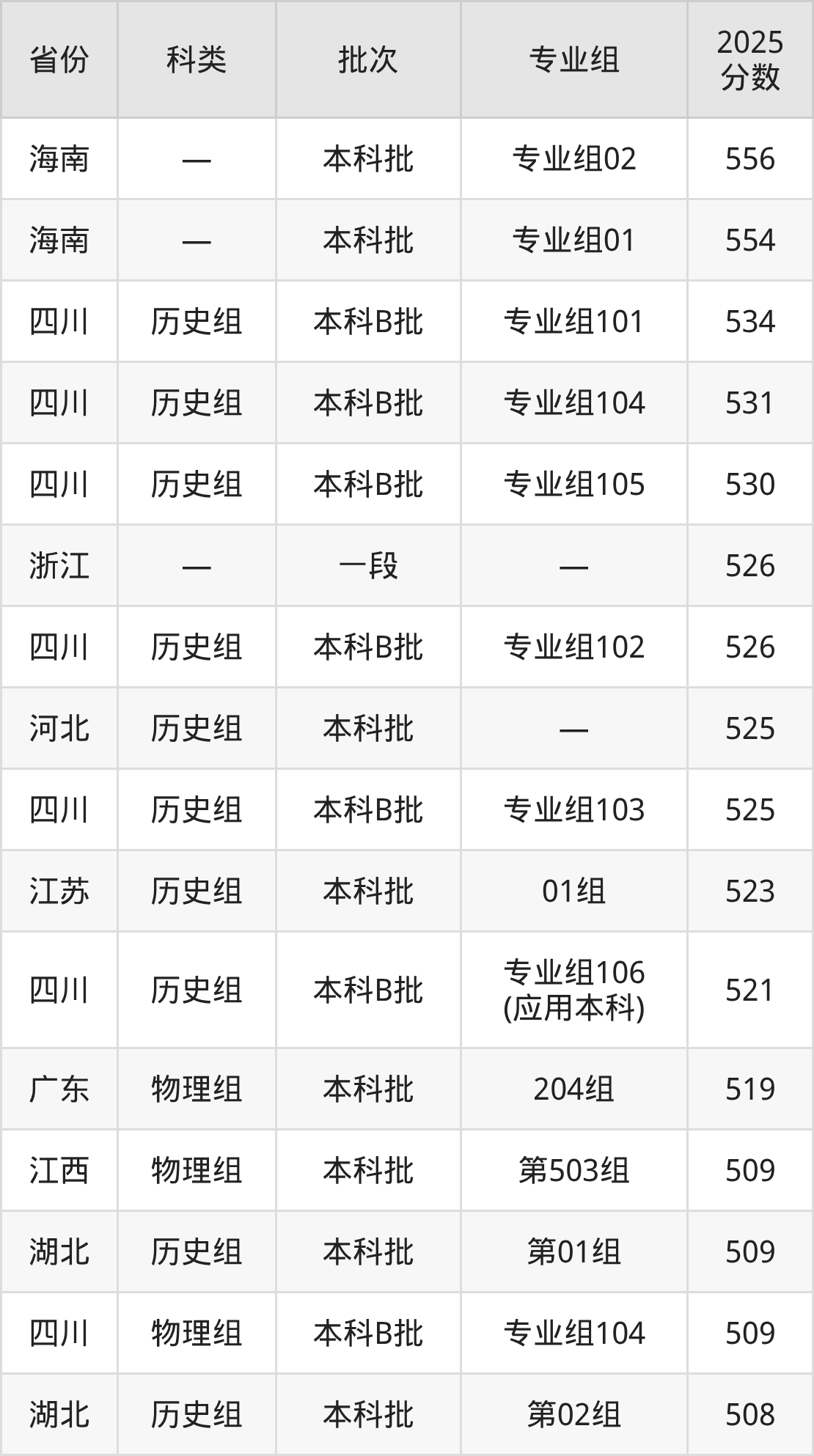 2025年西昌学院在全国普通批次招生的录取分数范围位于399~556分之间,其中省内分数范围为490分~534分,历史组最低分专业组为“专业组106(应用本科)”,考生521分即可报考,物理组最低分专业组为“专业组103”,考生490分即可报考。
