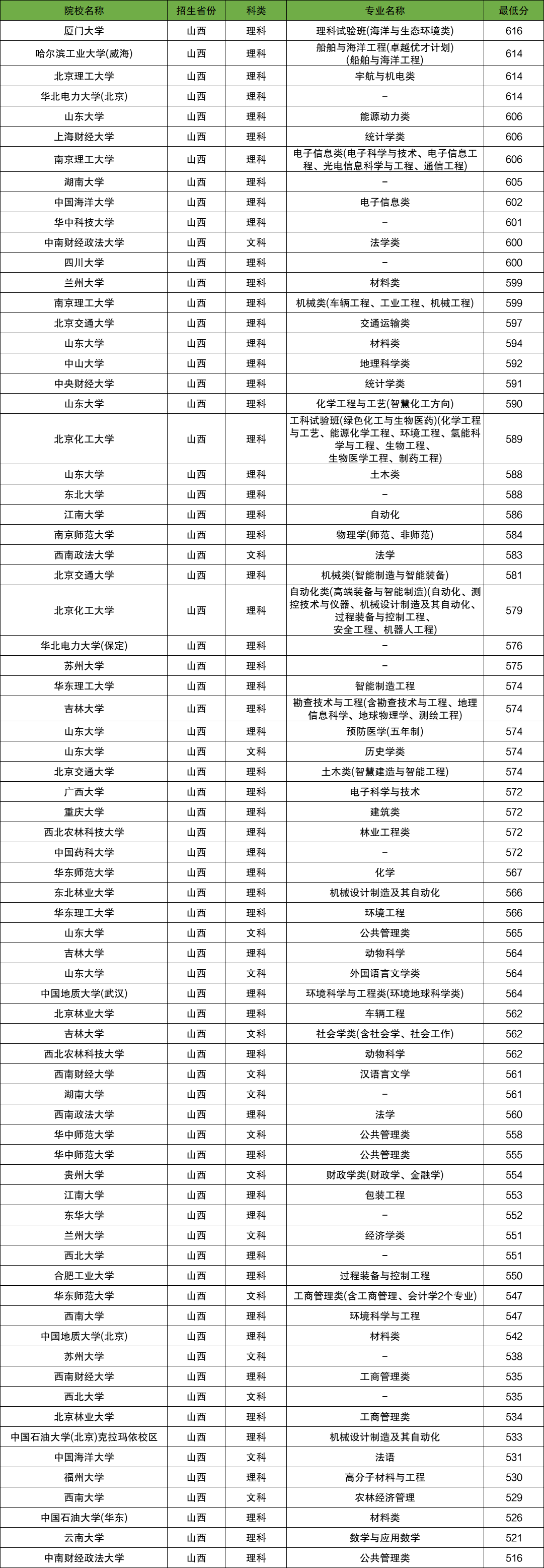 山西理科考生中比较容易考的有中南财经政法大学、云南大学、中国石油大学(华东),对应最低分为516分、521分、526分。
