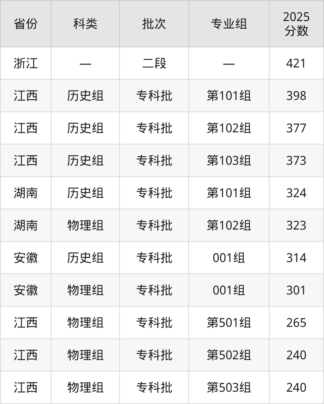 下面是江西管理职业学院2025年在全国各省的录取分数线一览表,供参考: