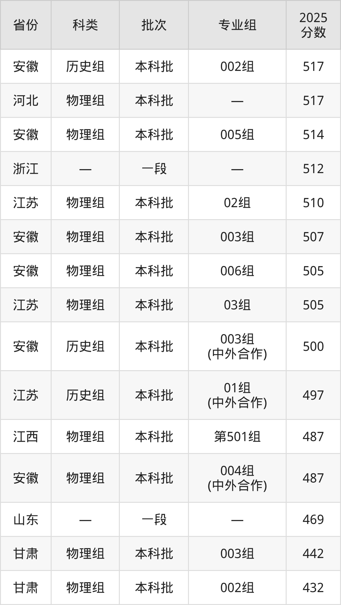 2025年巢湖学院在全国普通批次招生的录取分数范围位于432~517分之间,其中省内分数范围为487分~517分,历史组最低分专业组为“003组(中外合作)”,考生500分即可报考,物理组最低分专业组为“004组(中外合作)”,考生487分即可报考。