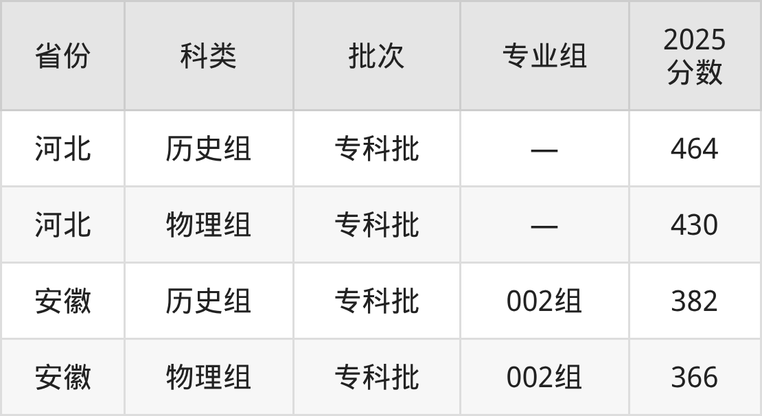 2025年亳州职业技术学院在全国普通批次招生的录取分数范围位于366~464分之间,其中省内分数范围为366分~382分,历史组最低分专业组为“002组”,考生382分即可报考,物理组最低分专业组为“002组”,考生366分即可报考。