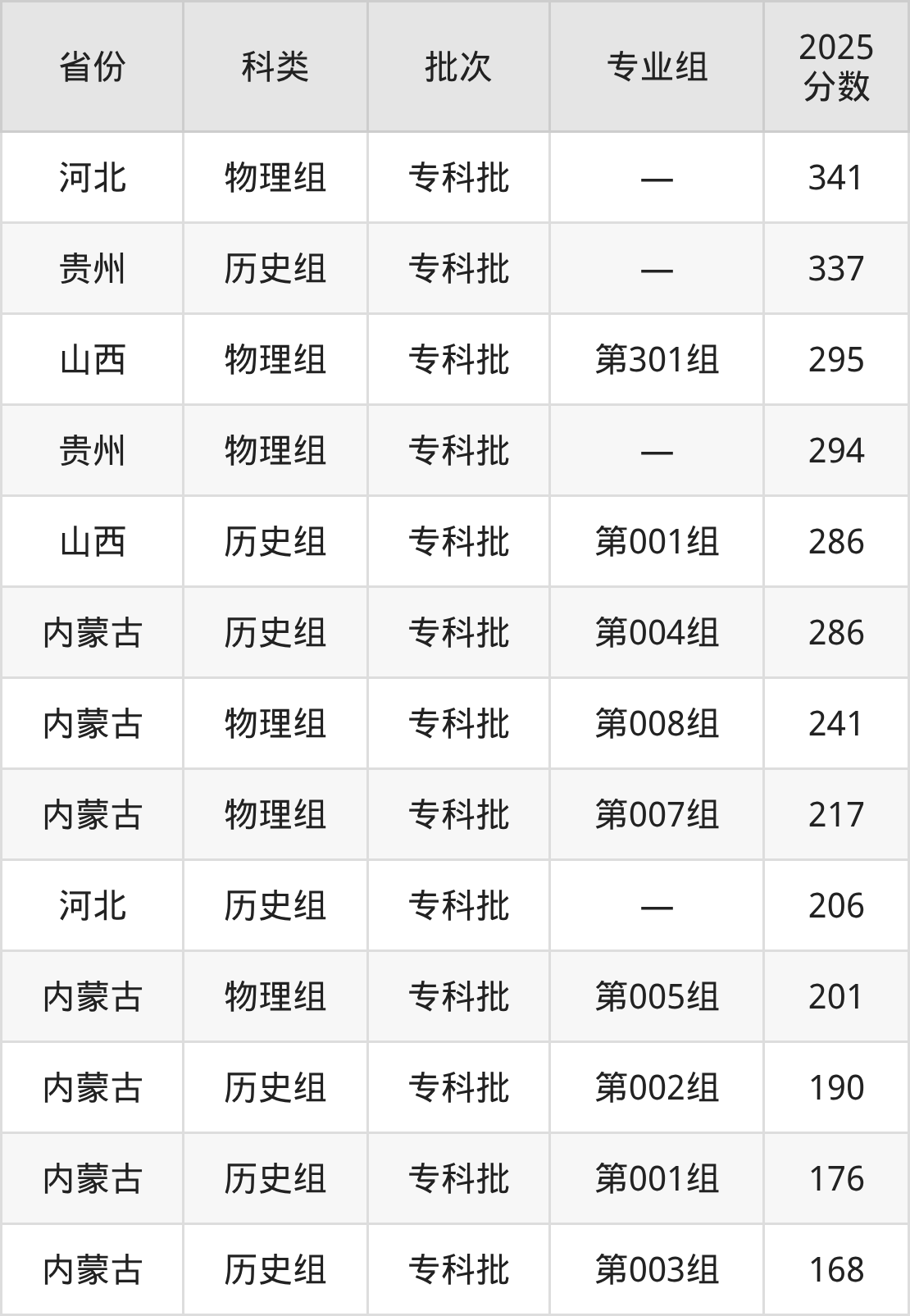 2025年乌兰察布职业学院在全国普通批次招生的录取分数范围位于168~341分之间,其中自治区内分数范围为168分~286分,历史组最低分专业组为“第003组”,考生168分即可报考,物理组最低分专业组为“第005组”,考生201分即可报考。