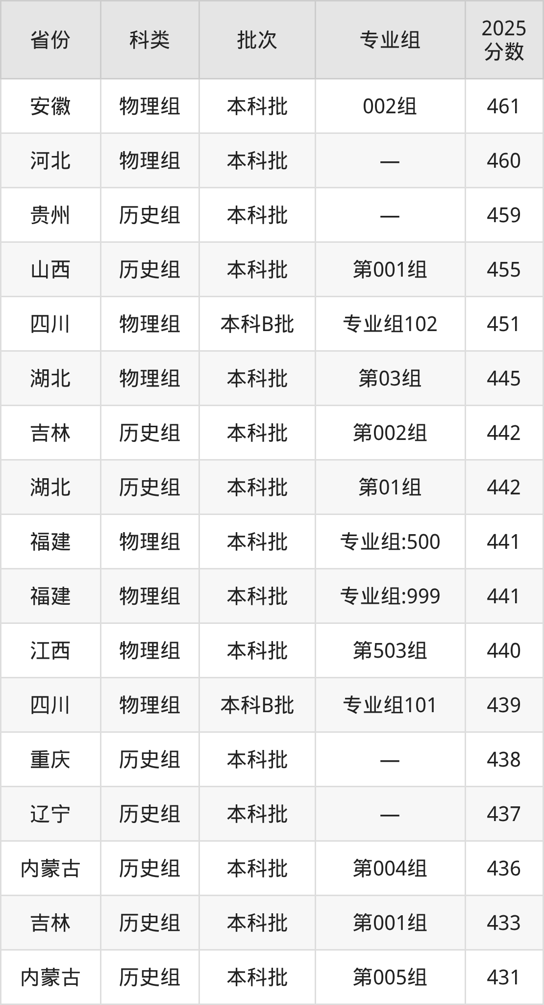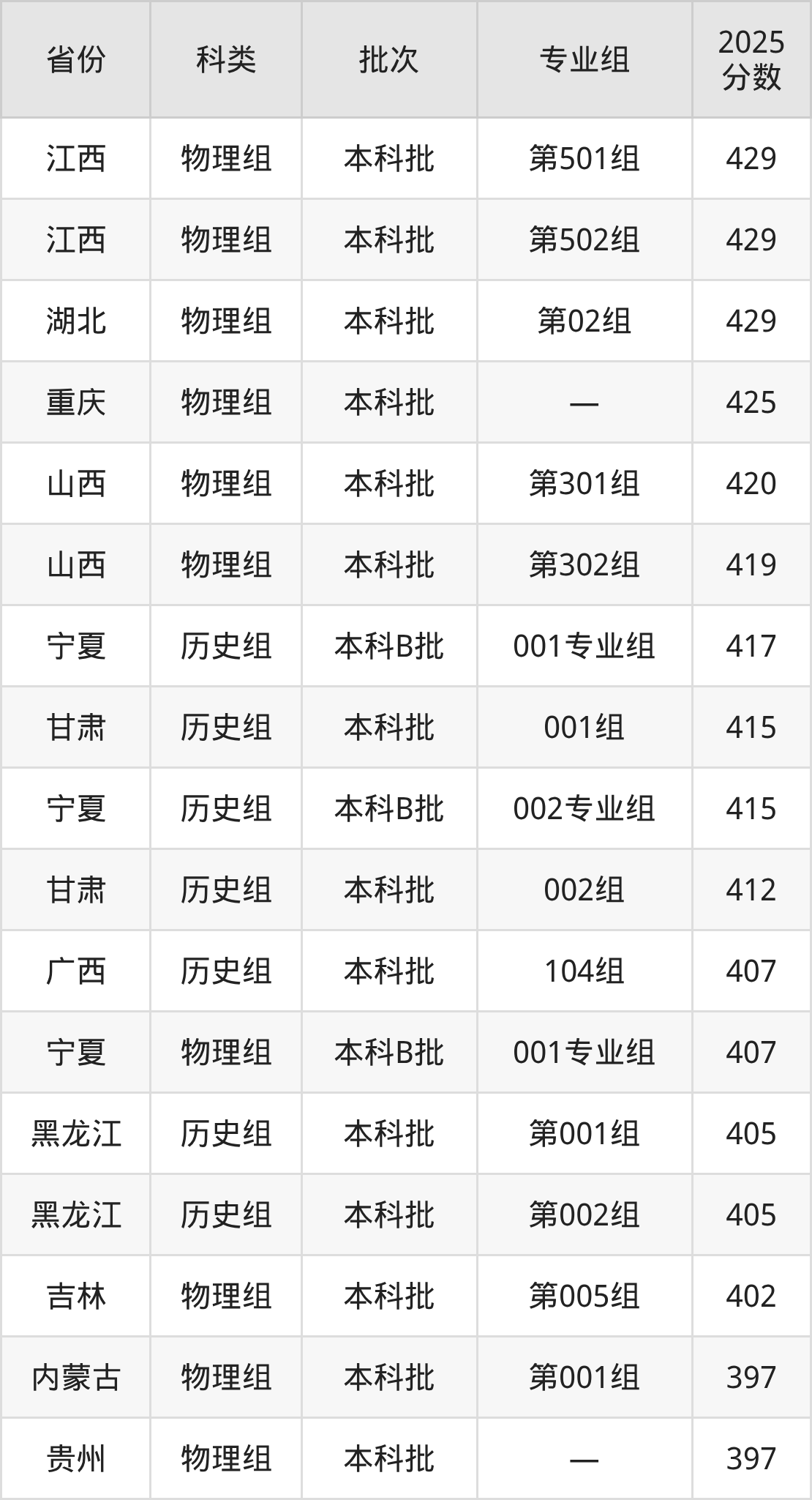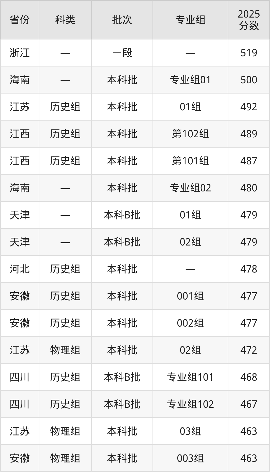 2025年黑龙江财经学院在全国普通批次招生的录取分数范围位于360~519分之间,其中省内分数范围为360分~405分,历史组最低分专业组为“第001组”,考生405分即可报考,物理组最低分专业组为“第004组”,考生360分即可报考。