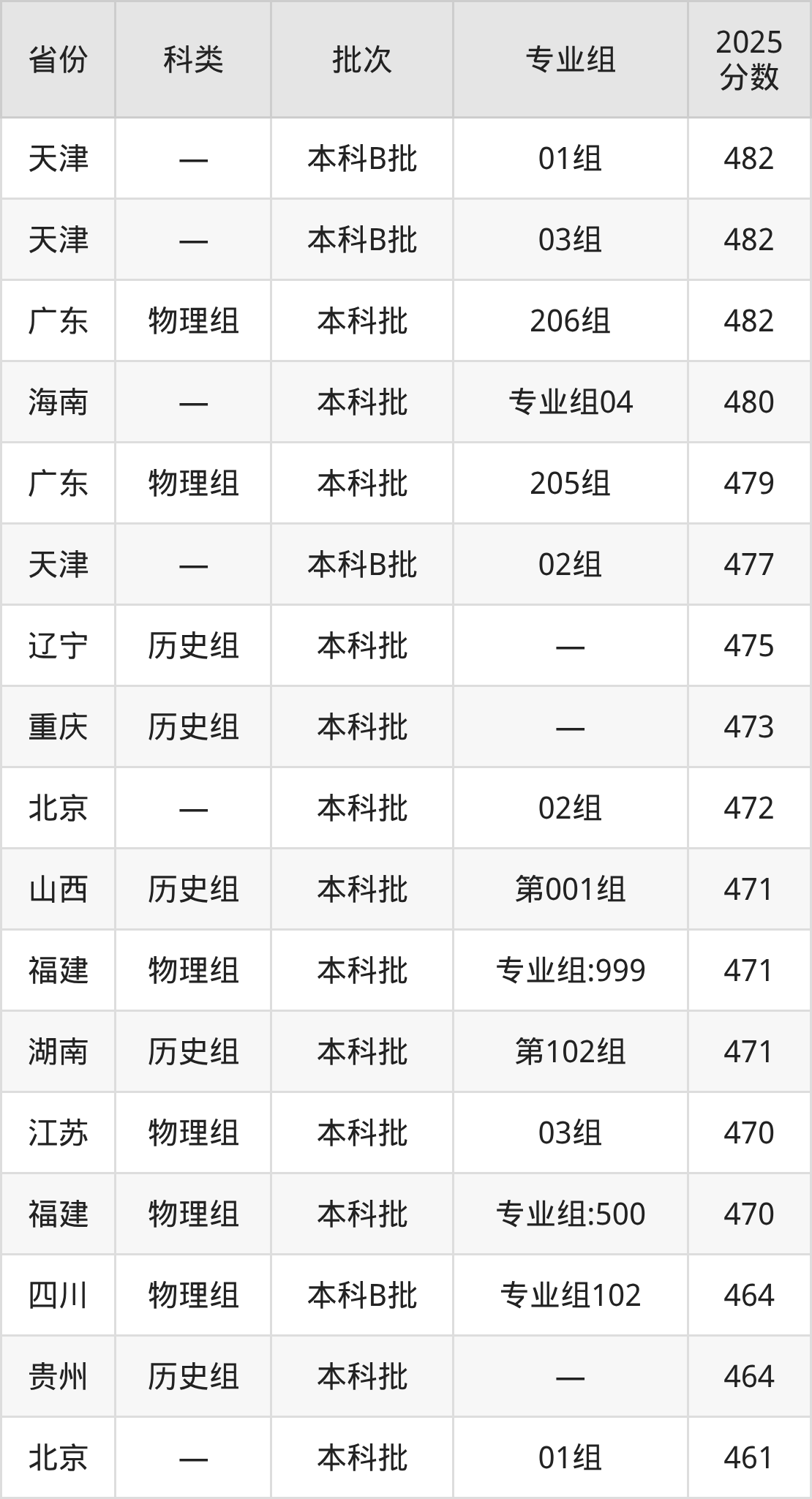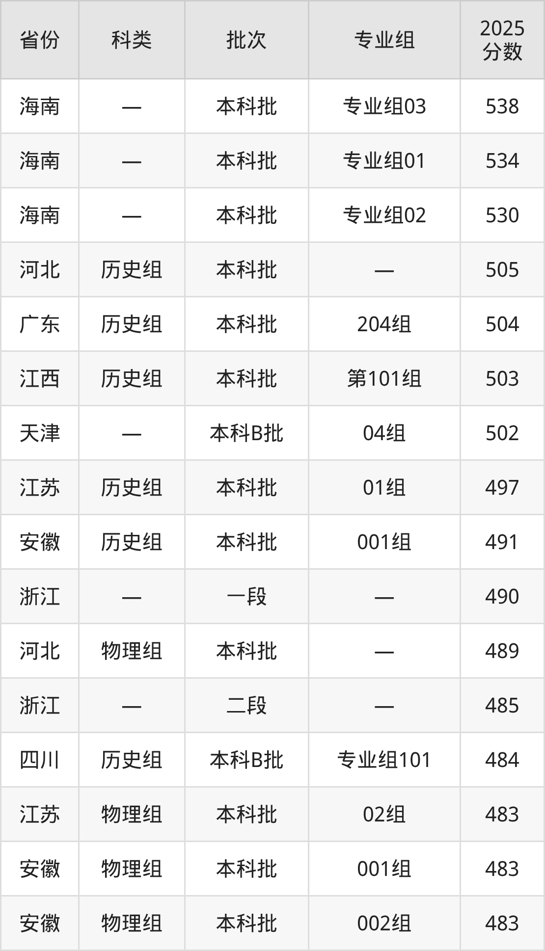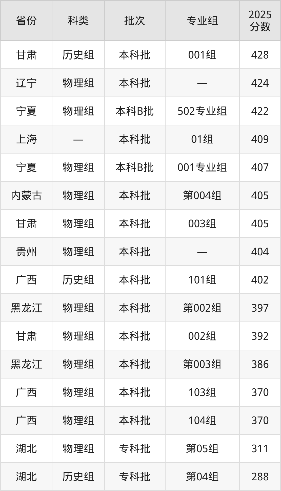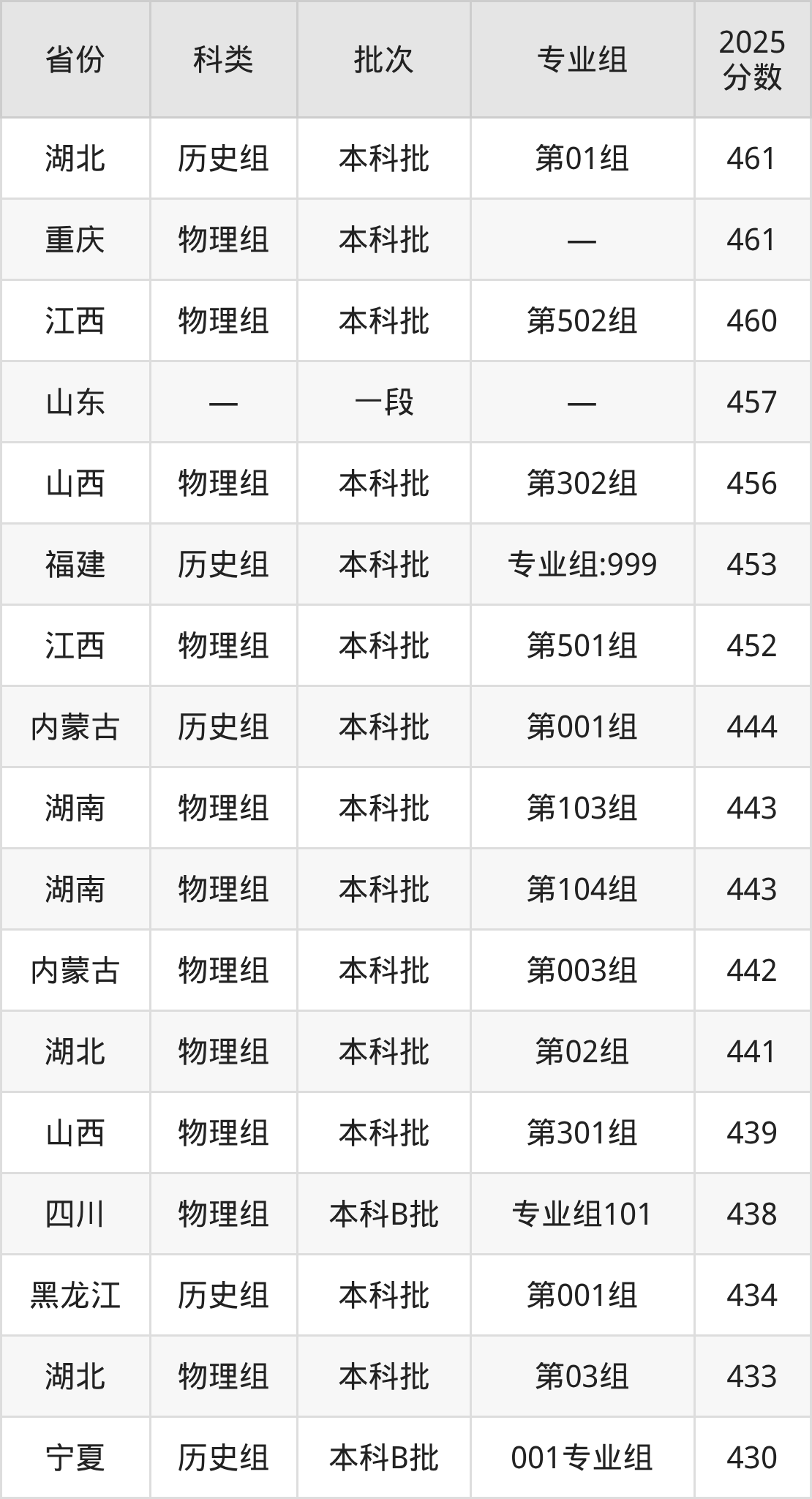 2025年武汉城市学院在全国普通批次招生的录取分数范围位于288~538分之间,其中省内分数范围为288分~461分,历史组最低分专业组为“第04组”,考生288分即可报考,物理组最低分专业组为“第05组”,考生311分即可报考。