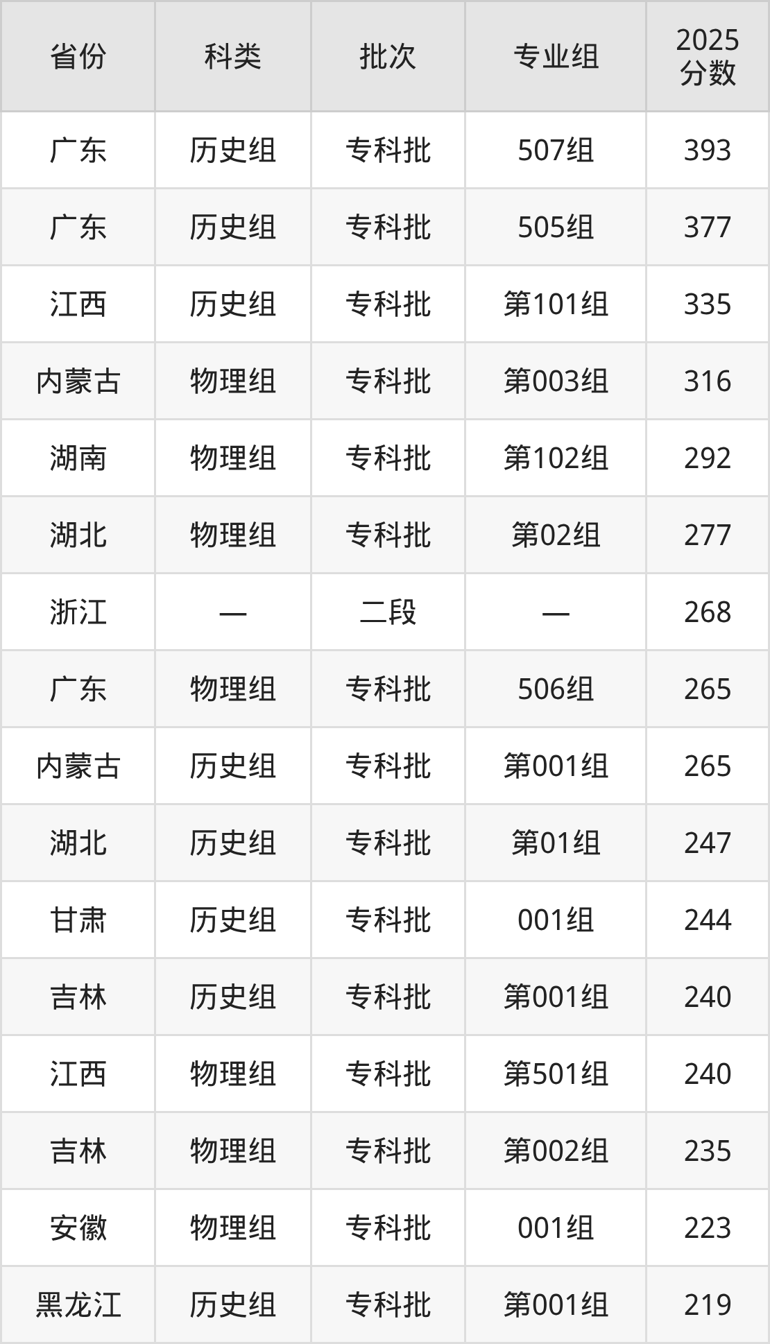 而广东地区历史组考生的分数门槛最高,2025年景德镇陶瓷职业技术学院507组在广东招生最低分为393分,考生至少要超专科线178分才有可能被录取。
