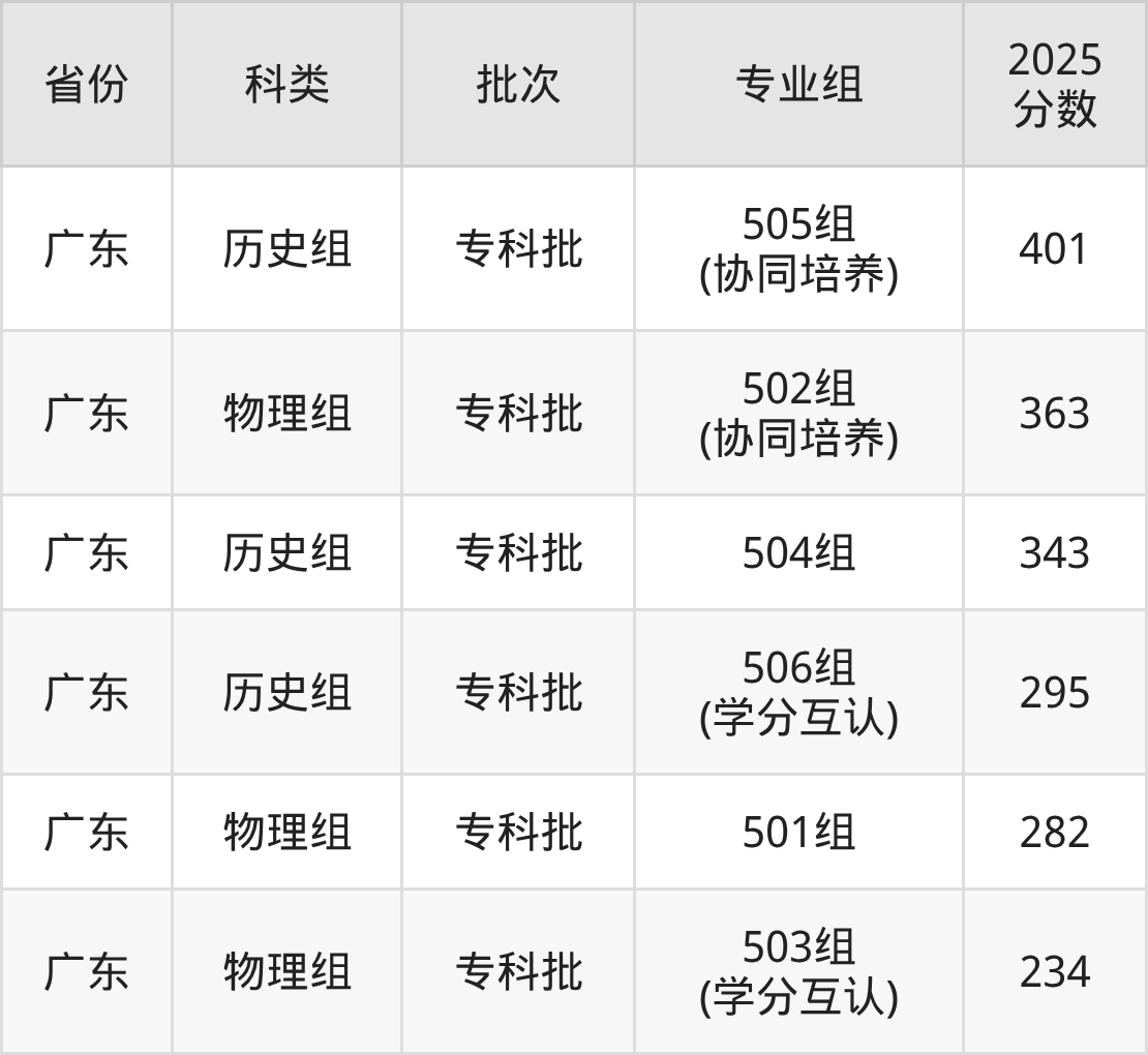 2025年潮汕职业技术学院在全国普通批次招生的录取分数范围位于234~401分之间,其中省内分数范围为234分~401分,历史组最低分专业组为“506组(学分互认)”,考生295分即可报考,物理组最低分专业组为“503组(学分互认)”,考生234分即可报考。