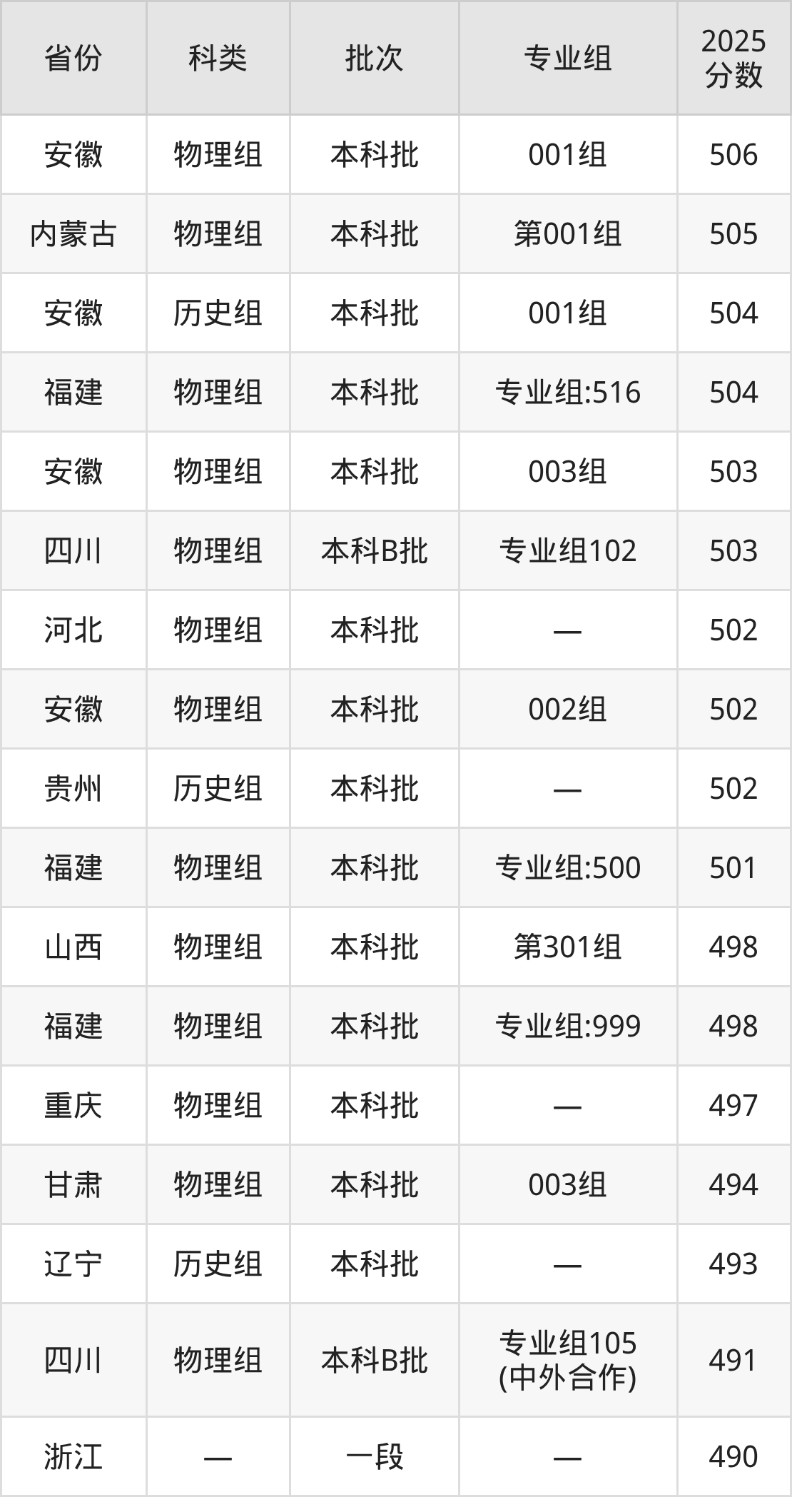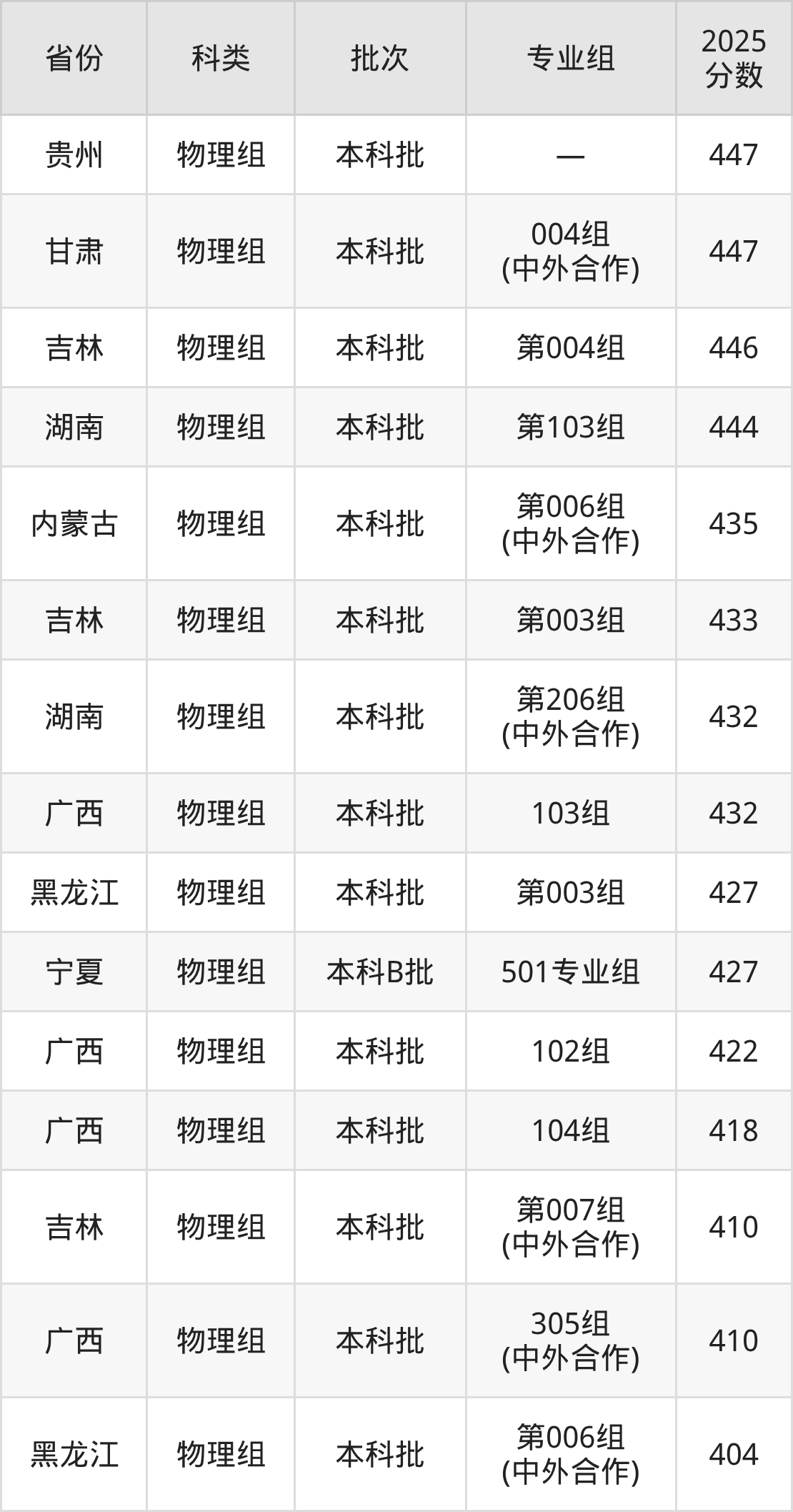 2025年吉林医药学院在全国普通批次招生的录取分数范围位于404~547分之间,其中省内分数范围为410分~486分,物理组最低分专业组为“第007组(中外合作)”,考生410分即可报考,历史组最低分专业组为“第002组”,考生470分即可报考。