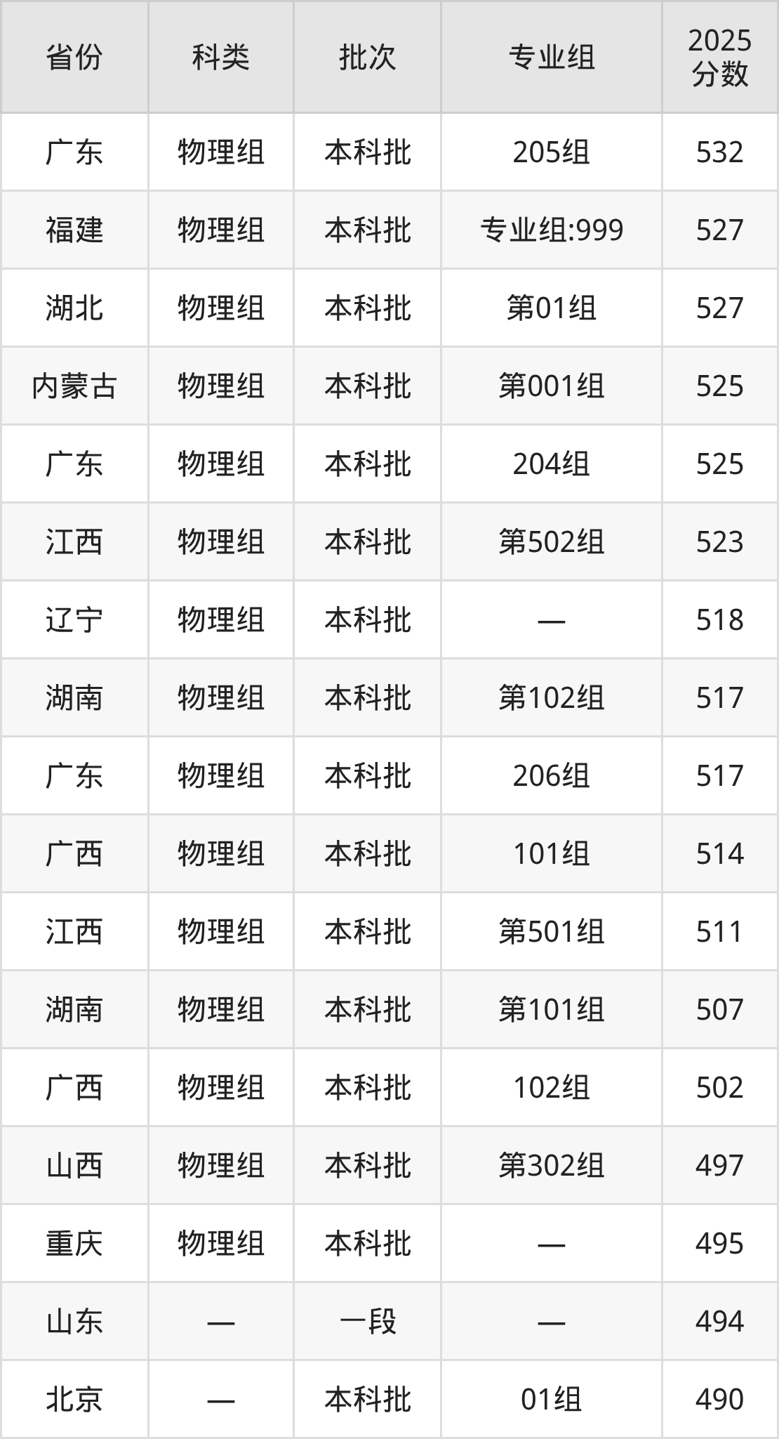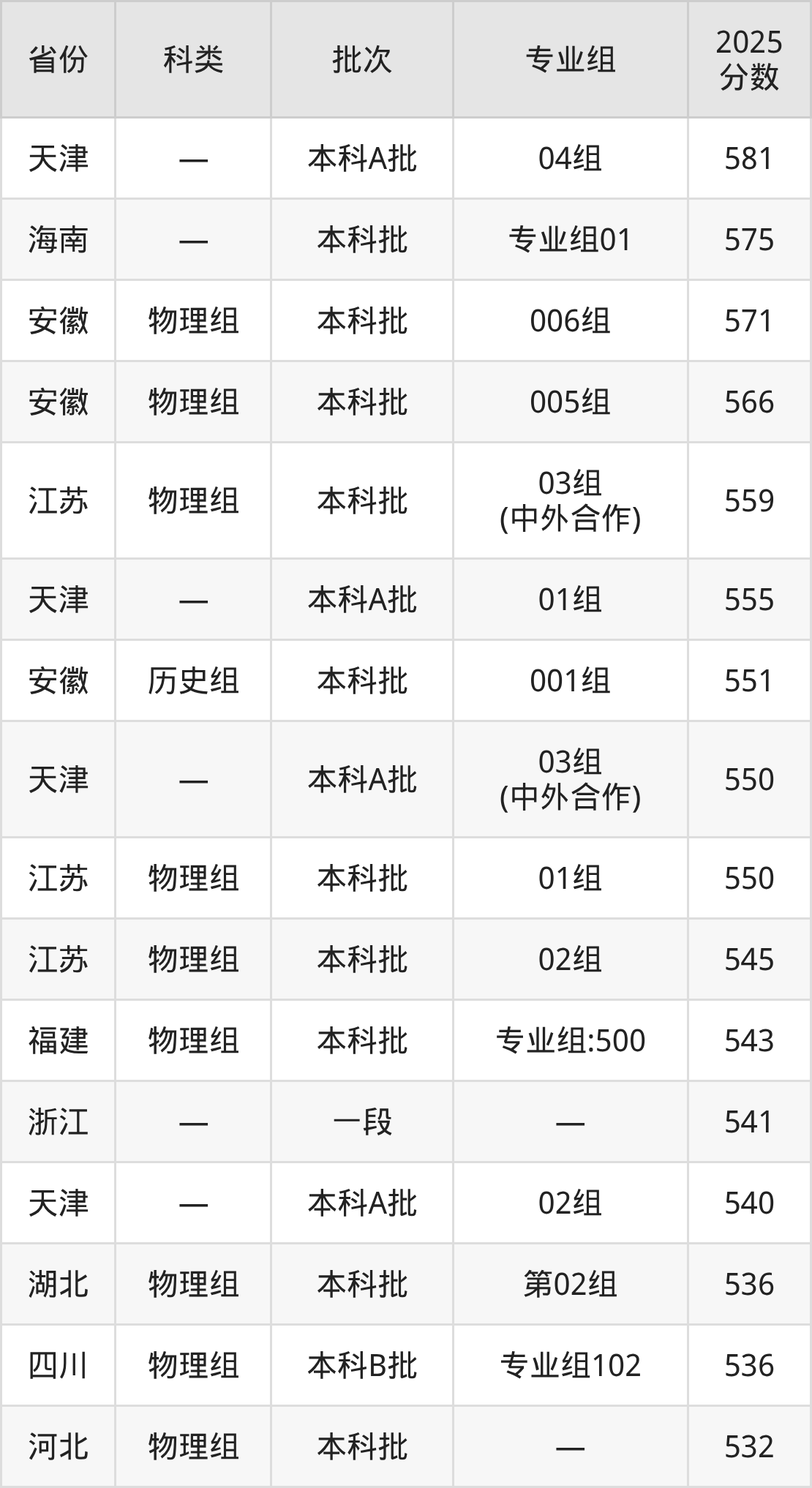 2025年安徽理工大学在全国普通批次招生的录取分数范围位于397~581分之间,其中省内分数范围为551分~571分,物理组最低分专业组为“005组”,考生566分即可报考,历史组最低分专业组为“001组”,考生551分即可报考。