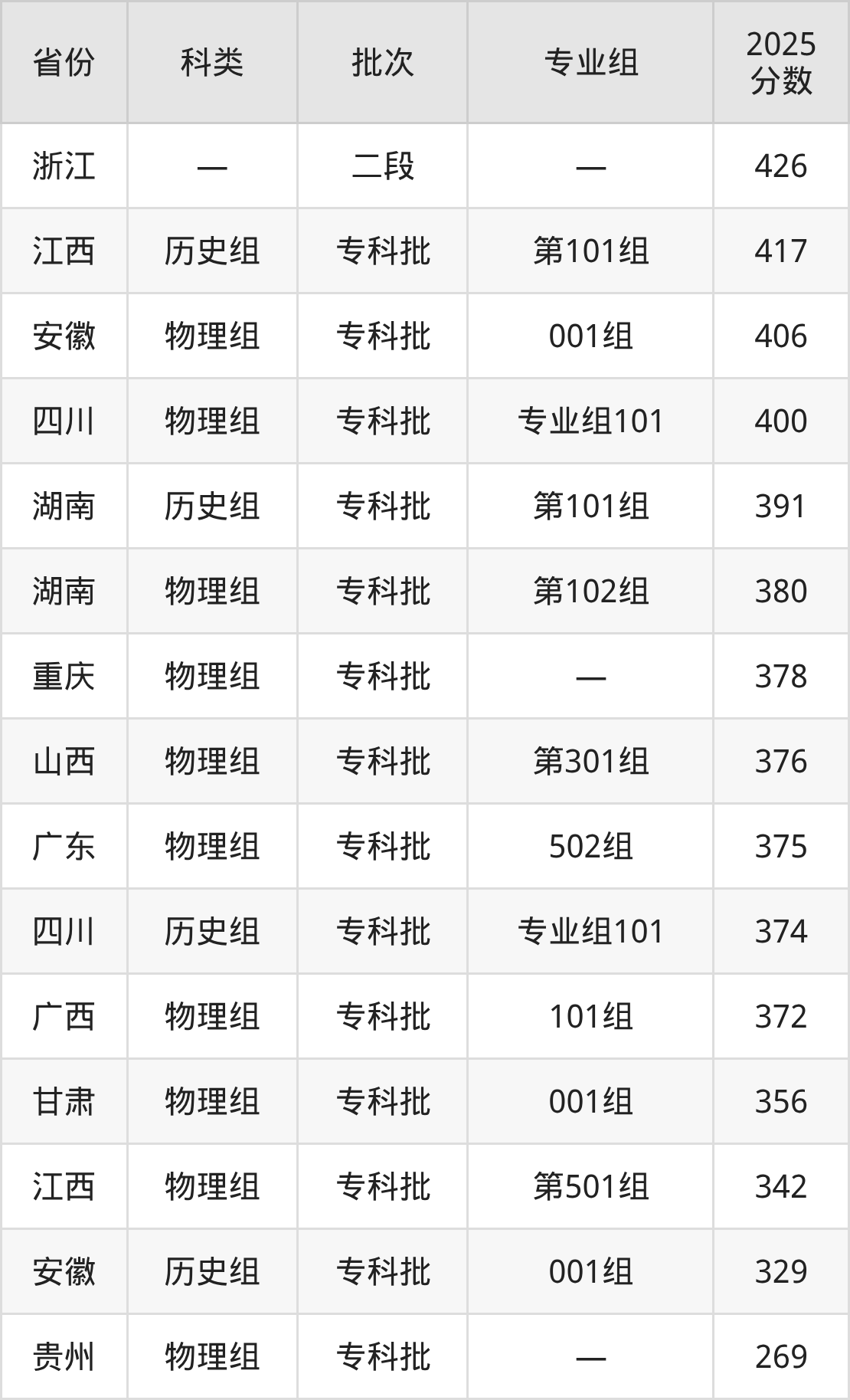 2025年江西工业职业技术学院在全国普通批次招生的录取分数范围位于269~426分之间,其中省内分数范围为342分~417分,历史组最低分专业组为“第101组”,考生417分即可报考,物理组最低分专业组为“第501组”,考生342分即可报考。