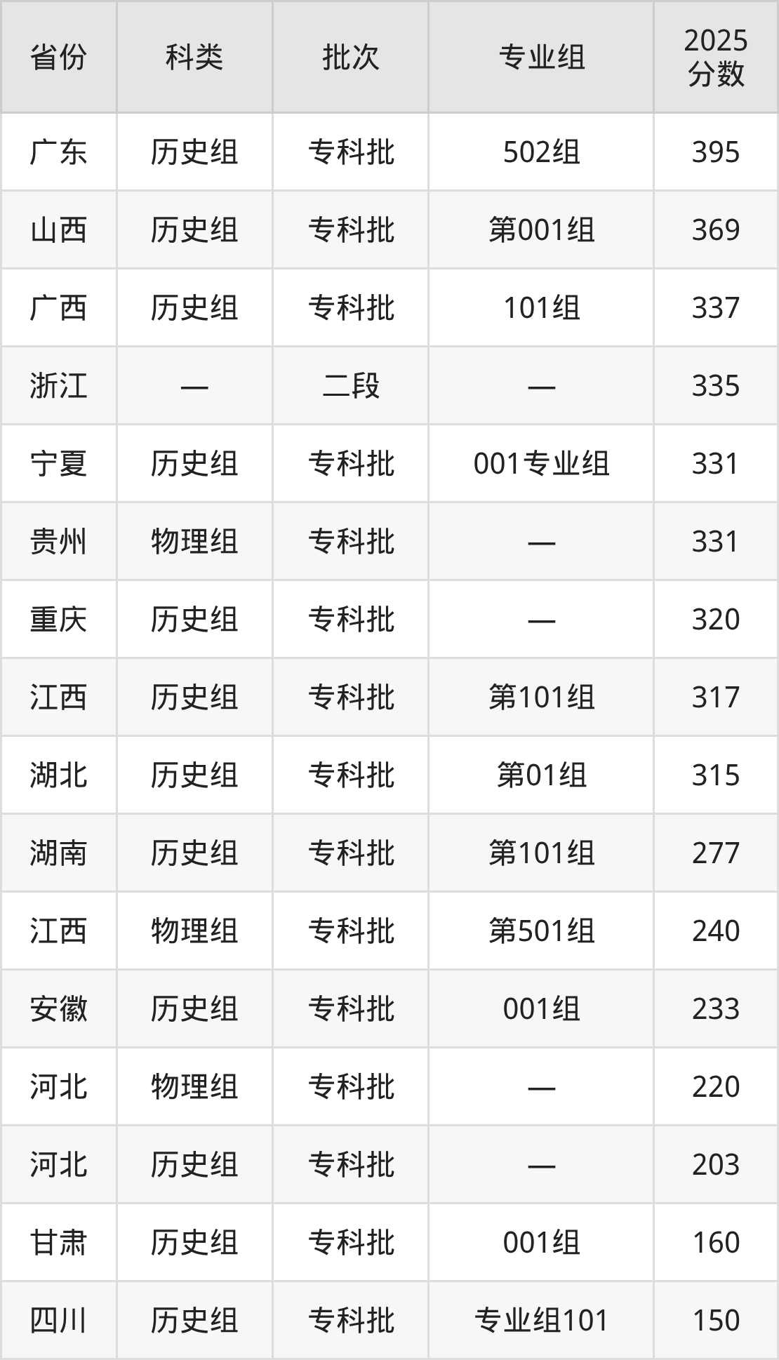 而广东地区历史组考生的分数门槛最高,2025年江西洪州职业学院502组在广东招生最低分为395分,考生至少要超专科线180分才有可能被录取。