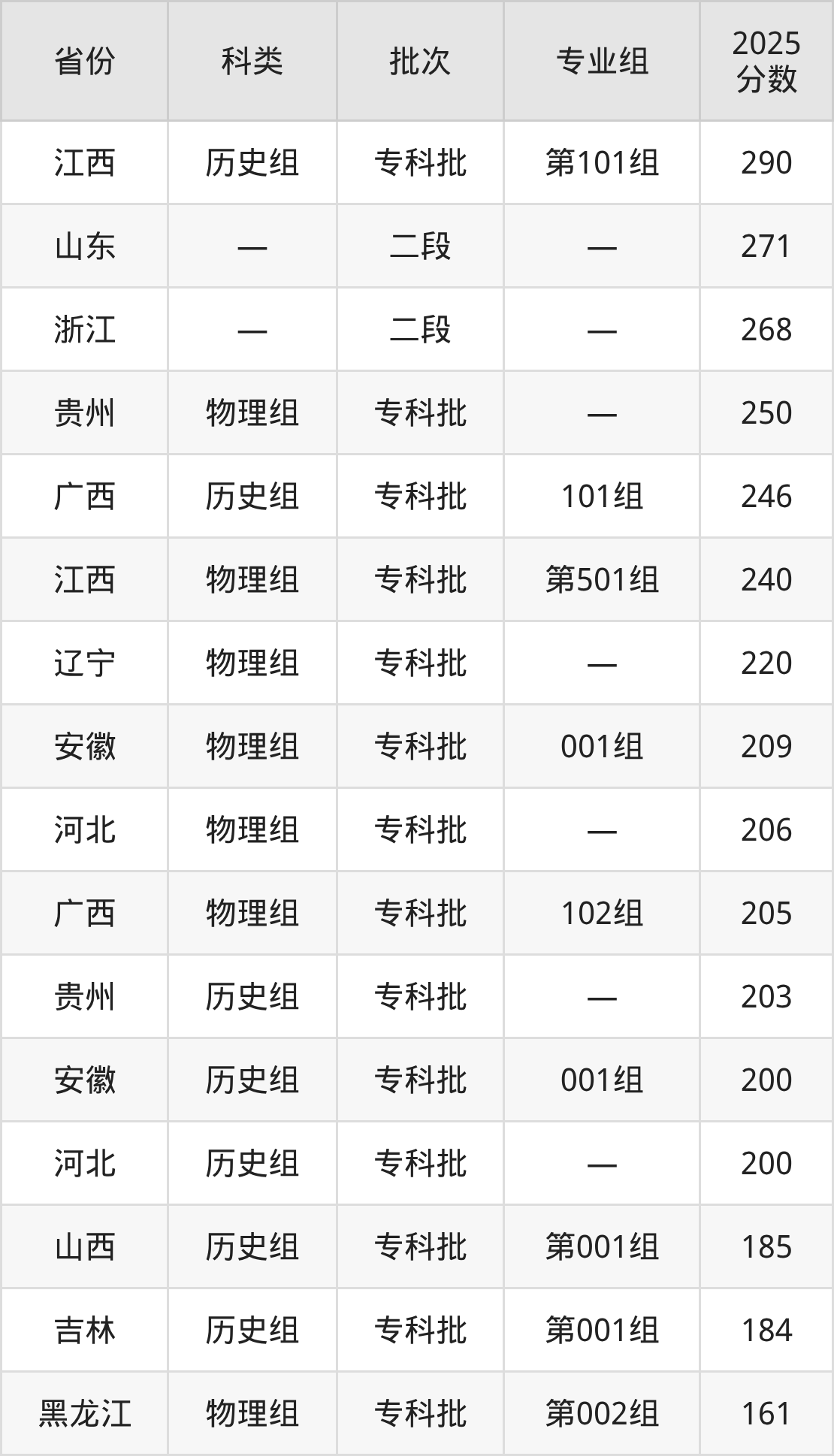 而江西地区历史组考生的分数门槛最高,2025年黑龙江三江美术职业学院第101组在江西招生最低分为290分,考生至少要超专科线0分才有可能被录取。