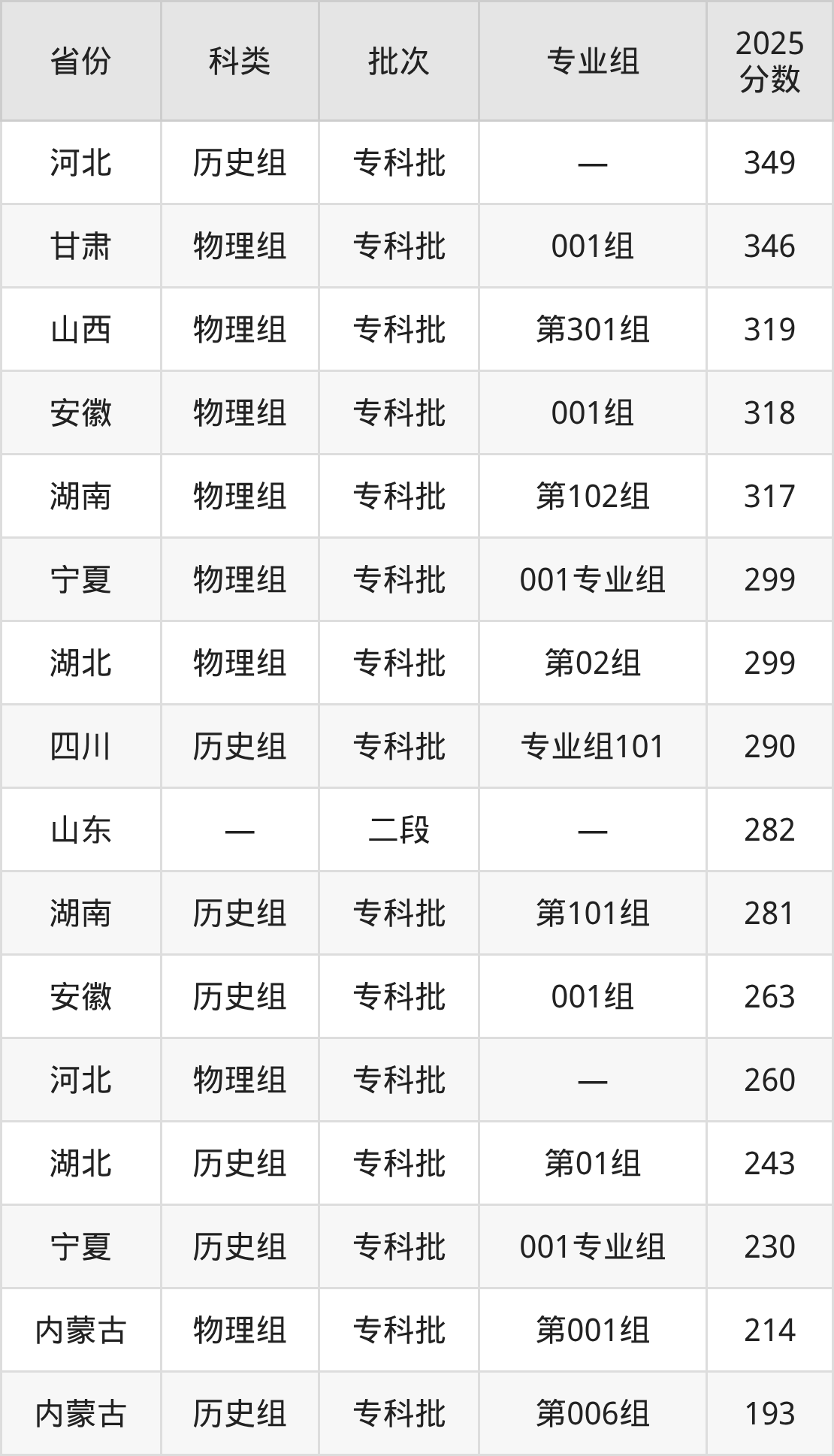 而河北地区历史组考生的分数门槛最高,2025年阿拉善职业技术学院在河北招生最低分为349分,考生至少要超专科线149分才有可能被录取。