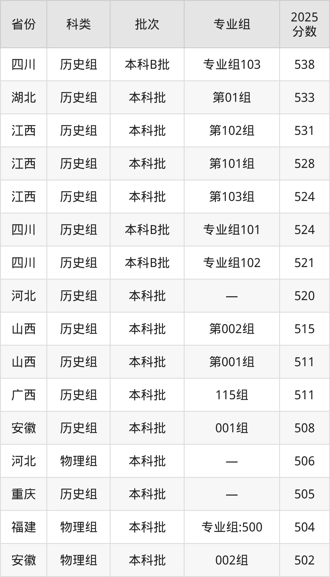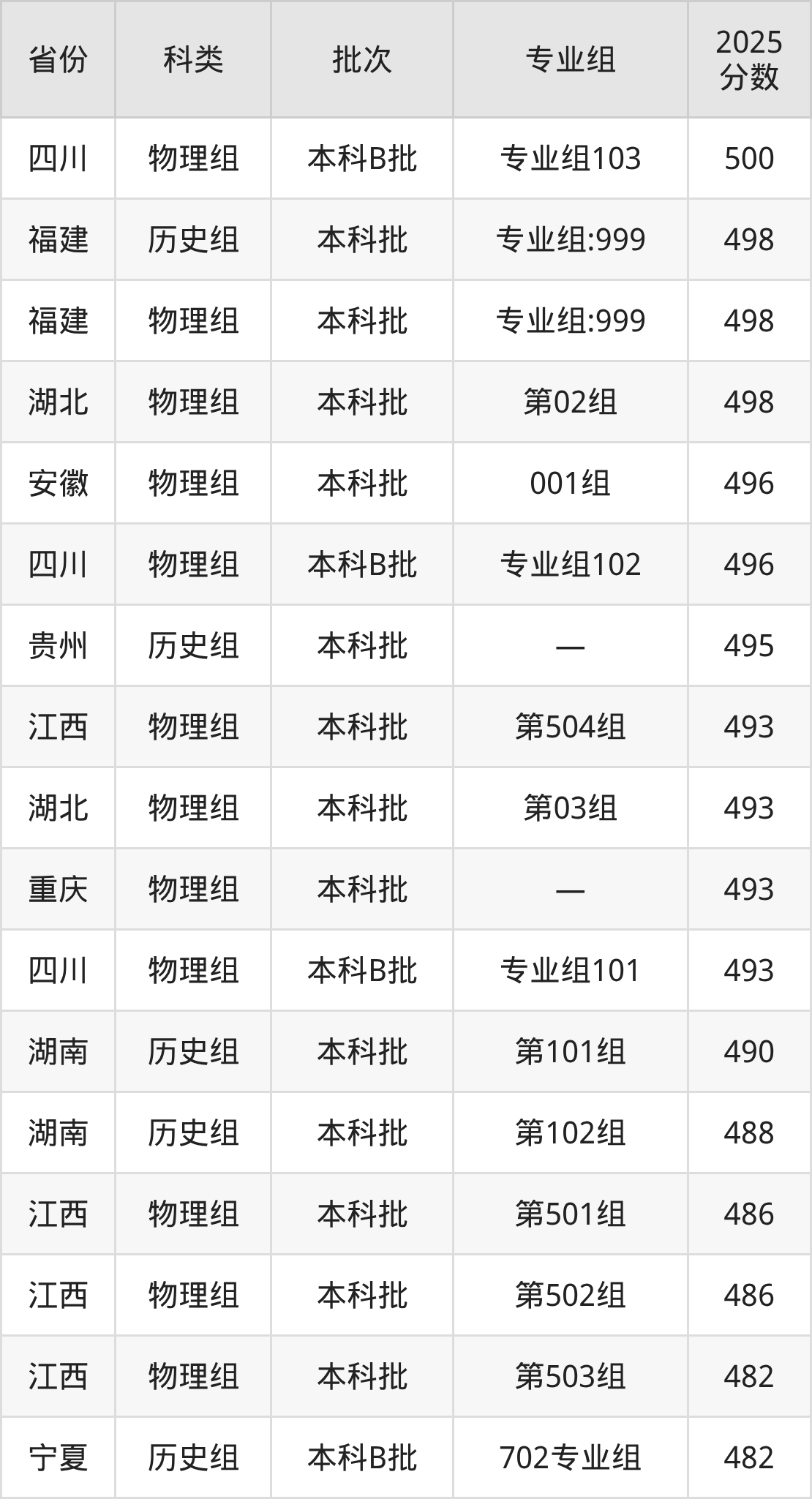 2025年福建技术师范学院在全国普通批次招生的录取分数范围位于407~538分之间,其中省内分数范围为498分~504分,历史组最低分专业组为“专业组:999”,考生498分即可报考,物理组最低分专业组为“专业组:999”,考生498分即可报考。